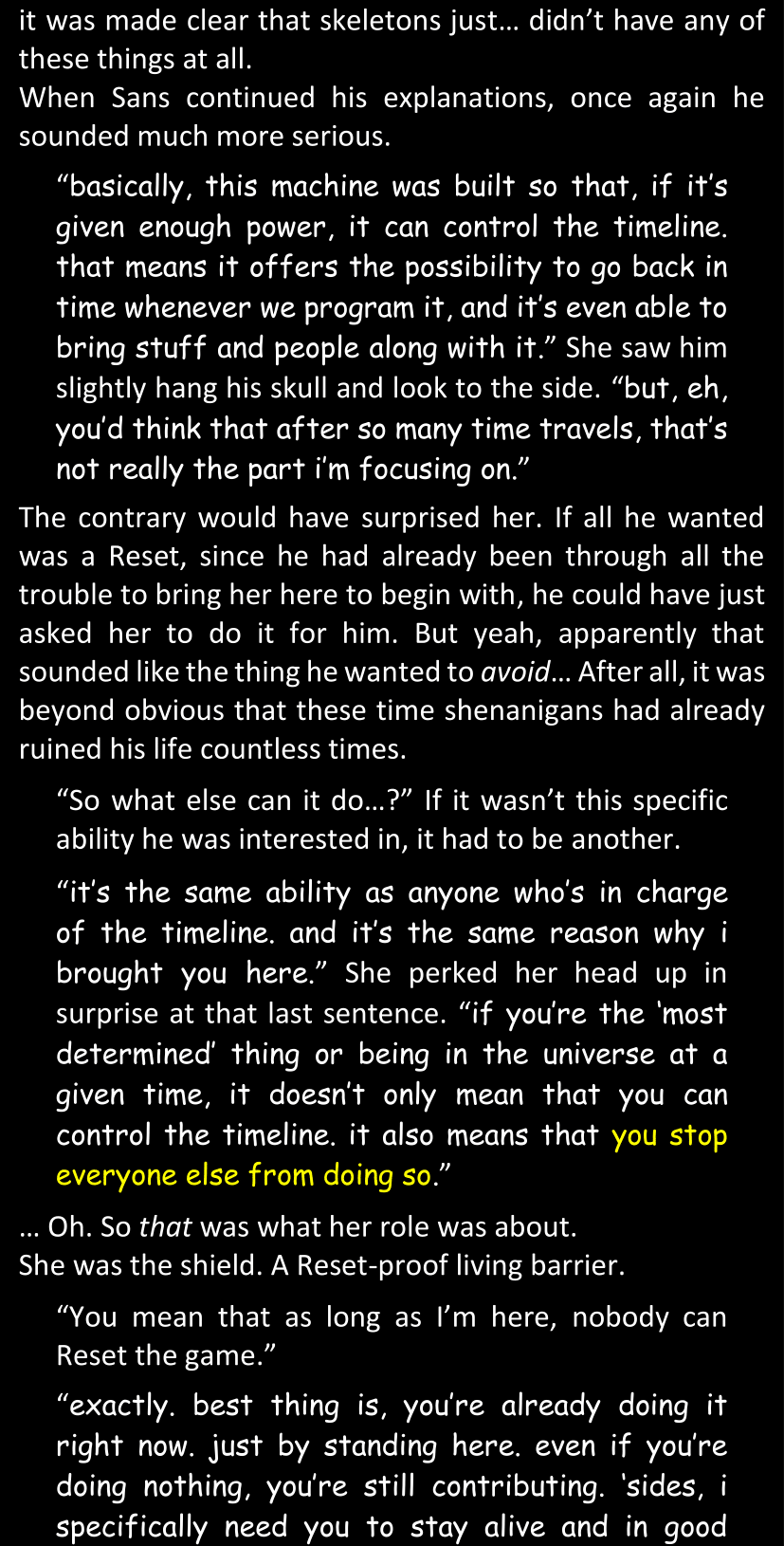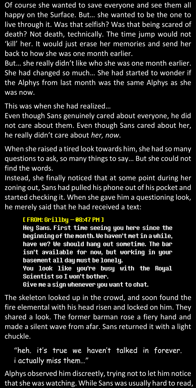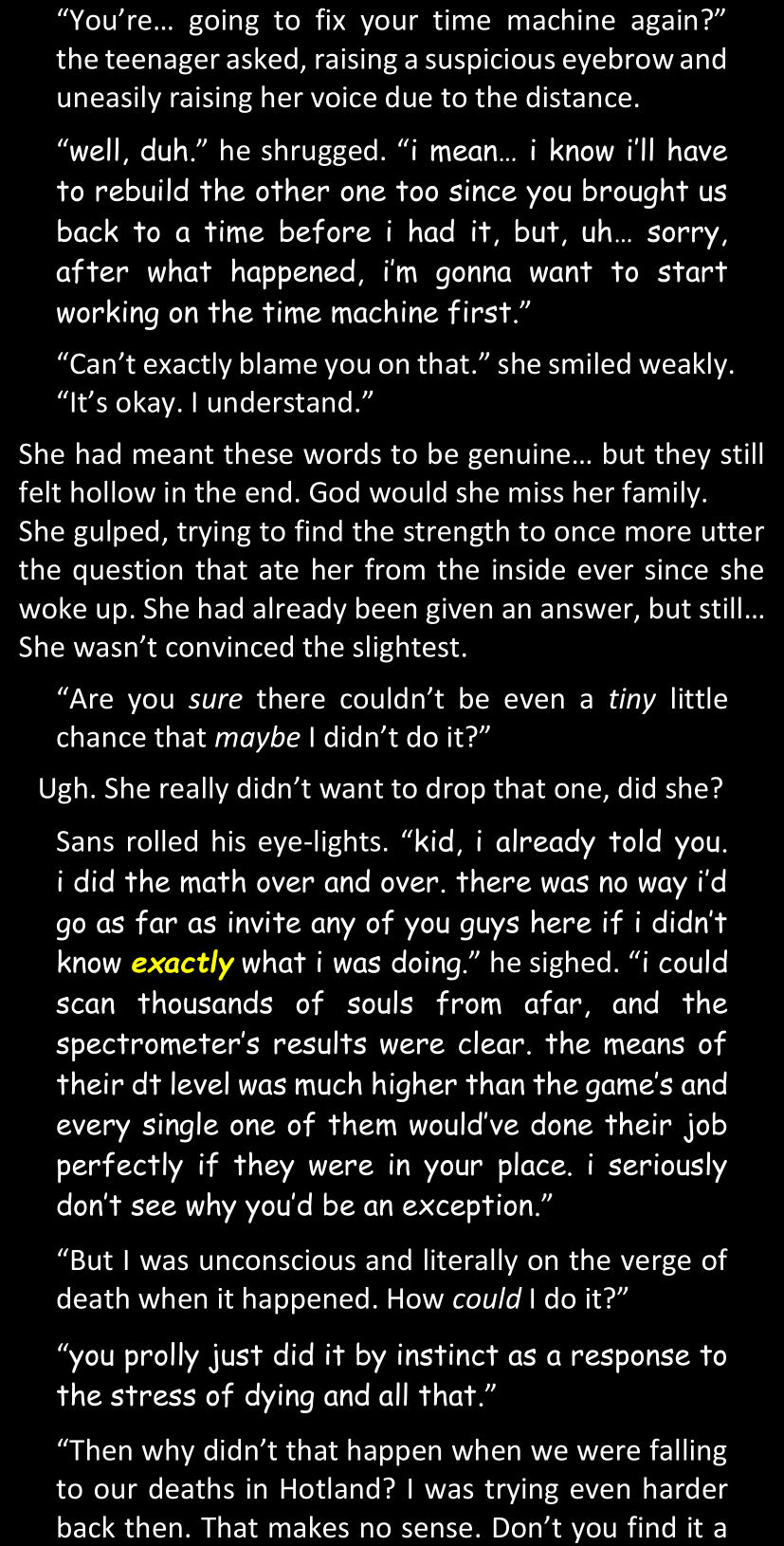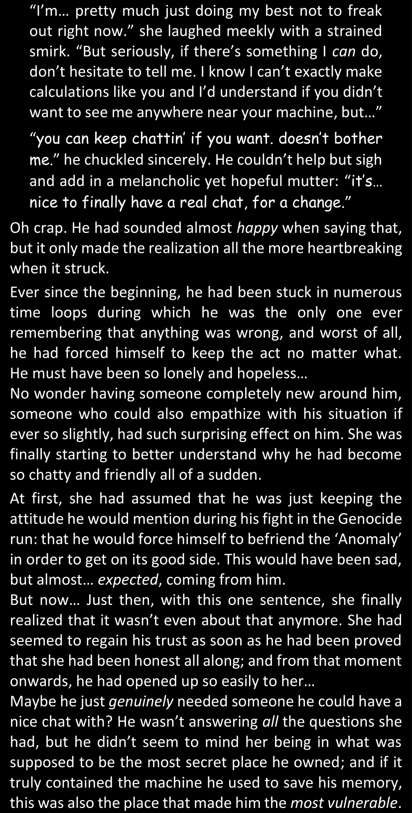 When Sans finally gets to see Dawn’s phone, he sees that the time it shows is still that of her original world… and he realizes that from her perspective, since she is the only one who is not affected by the Resets at all, she actually has been awake and running through stressful situations for more than twenty-four hours straight. He suddenly understands a lot more why she was so exhausted and emotionally unstable.