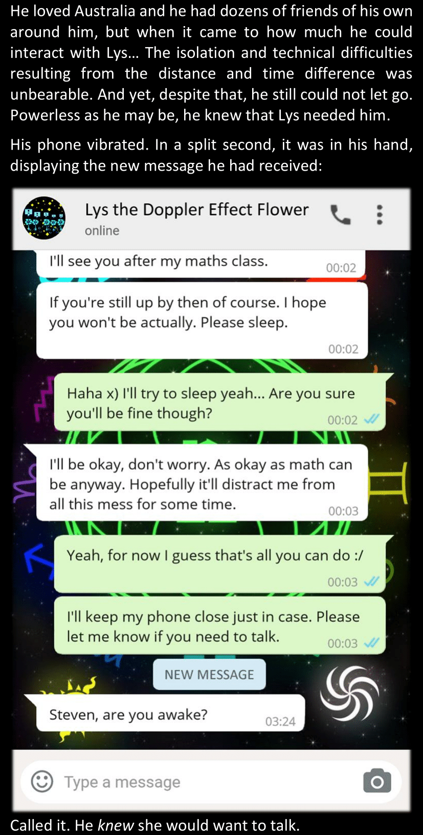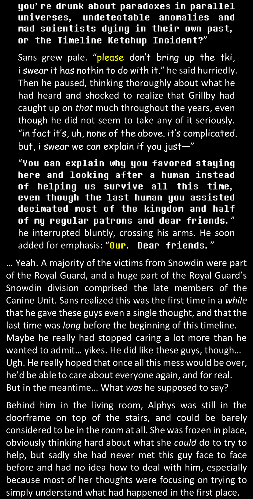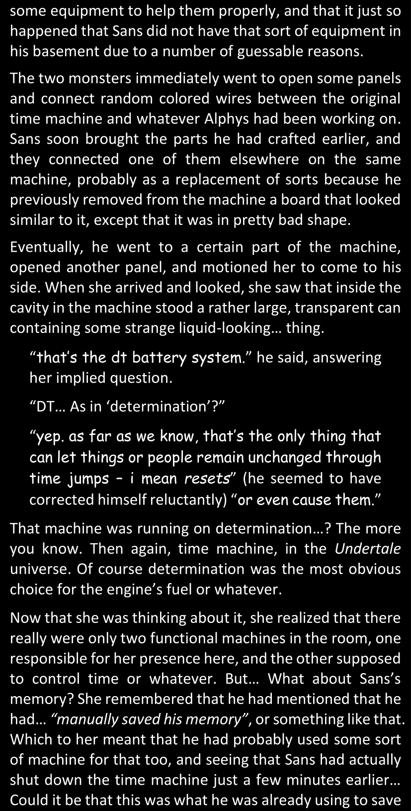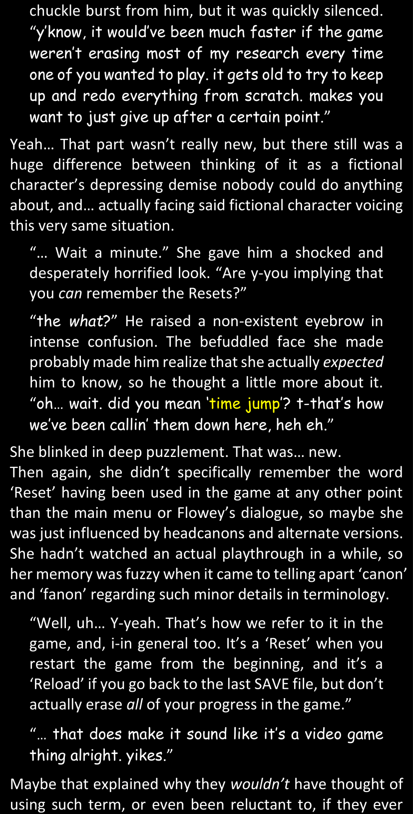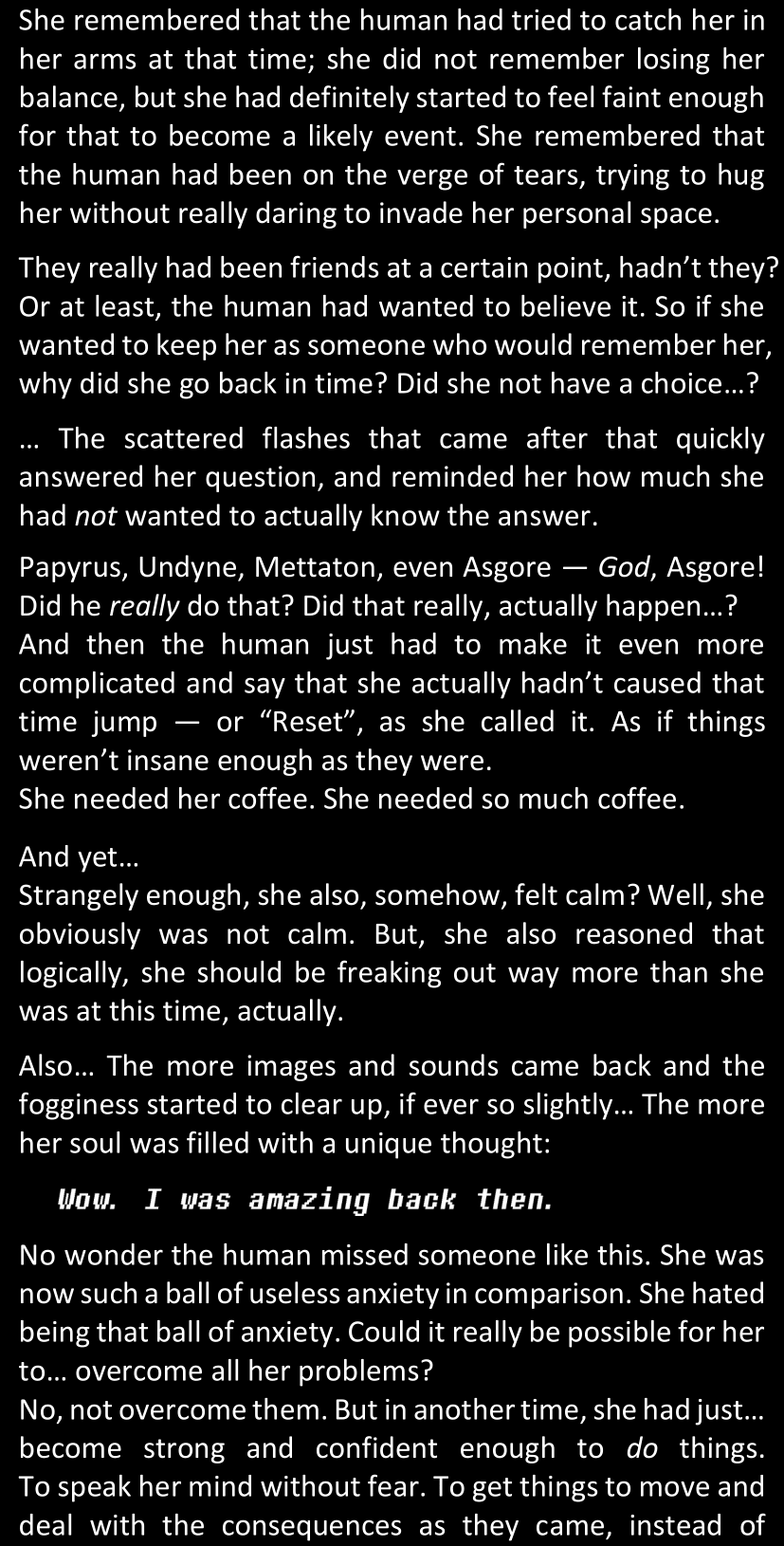 When Sans finally gets to see Dawn’s phone, he sees that the time it shows is still that of her original world… and he realizes that from her perspective, since she is the only one who is not affected by the Resets at all, she actually has been awake and running through stressful situations for more than twenty-four hours straight. He suddenly understands a lot more why she was so exhausted and emotionally unstable.