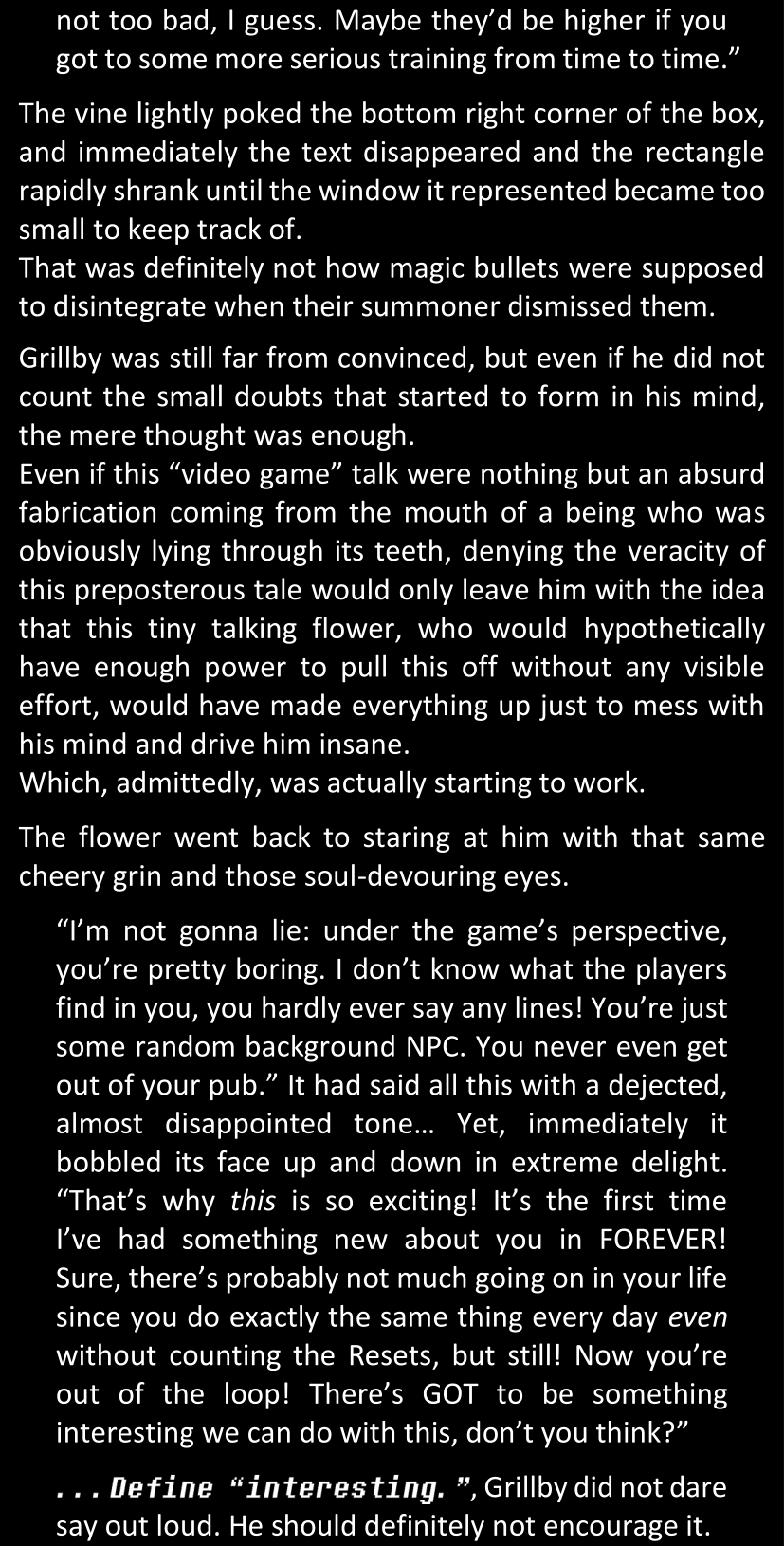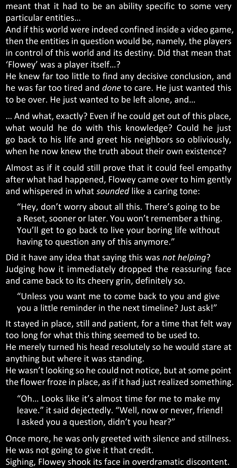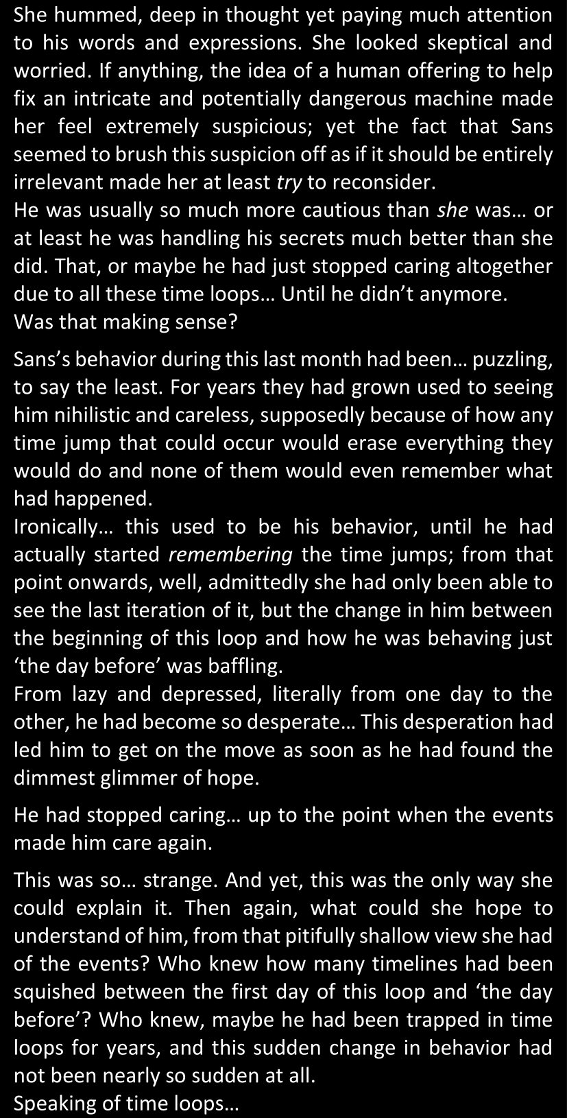 “Just look at him. He was so chatty when he thought his plan had worked. So proud. And yet now that he’s back to being stuck in the Resets, looks like he’s already gone back to his old habits. How many times did he dodge your questions? Just as many questions he would’ve gladly answered if you’d asked them earlier… Or maybe he wouldn’t have. You really don’t have the slightest clue what you’ve gotten yourself into, have you?”