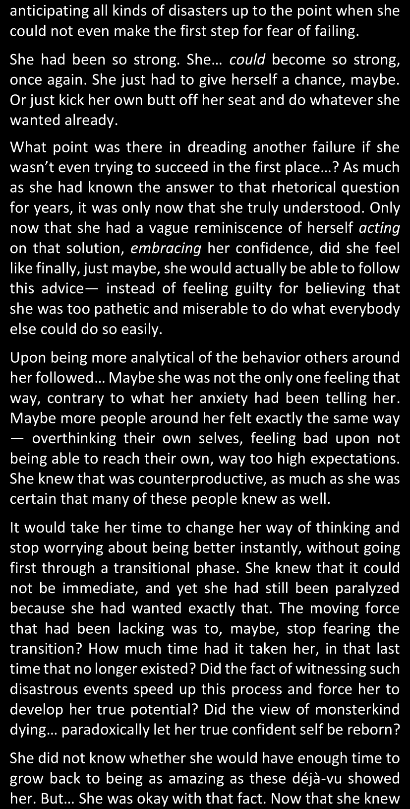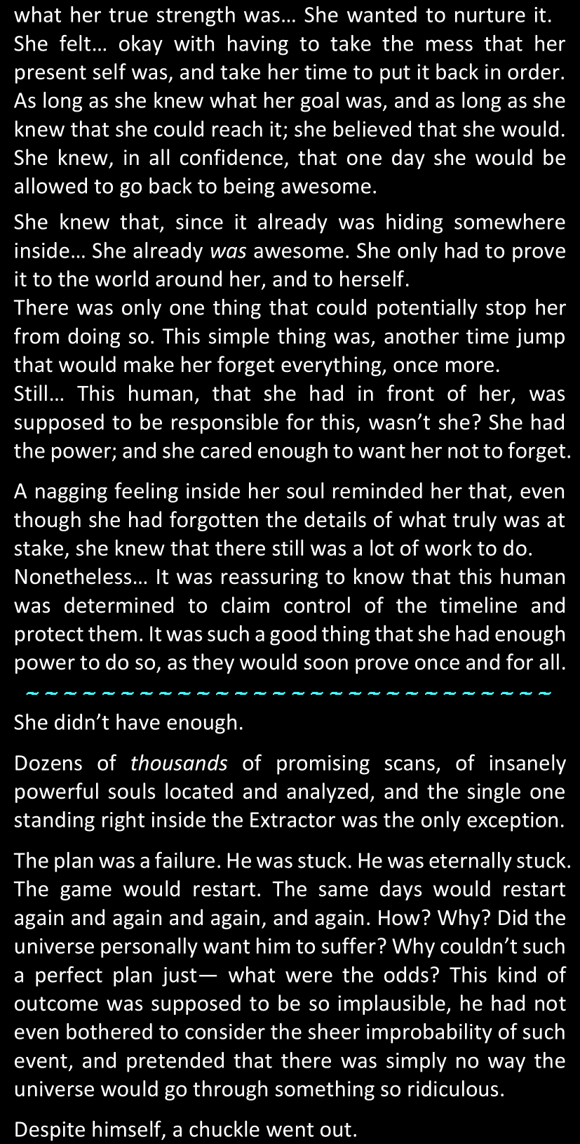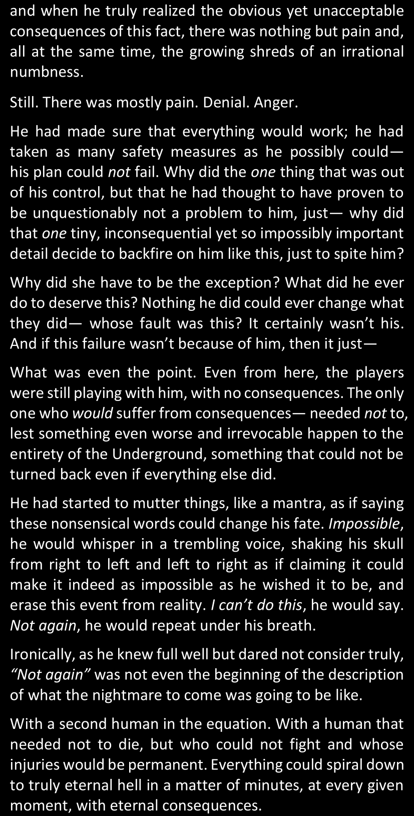 “Just look at him. He was so chatty when he thought his plan had worked. So proud. And yet now that he’s back to being stuck in the Resets, looks like he’s already gone back to his old habits. How many times did he dodge your questions? Just as many questions he would’ve gladly answered if you’d asked them earlier… Or maybe he wouldn’t have. You really don’t have the slightest clue what you’ve gotten yourself into, have you?”