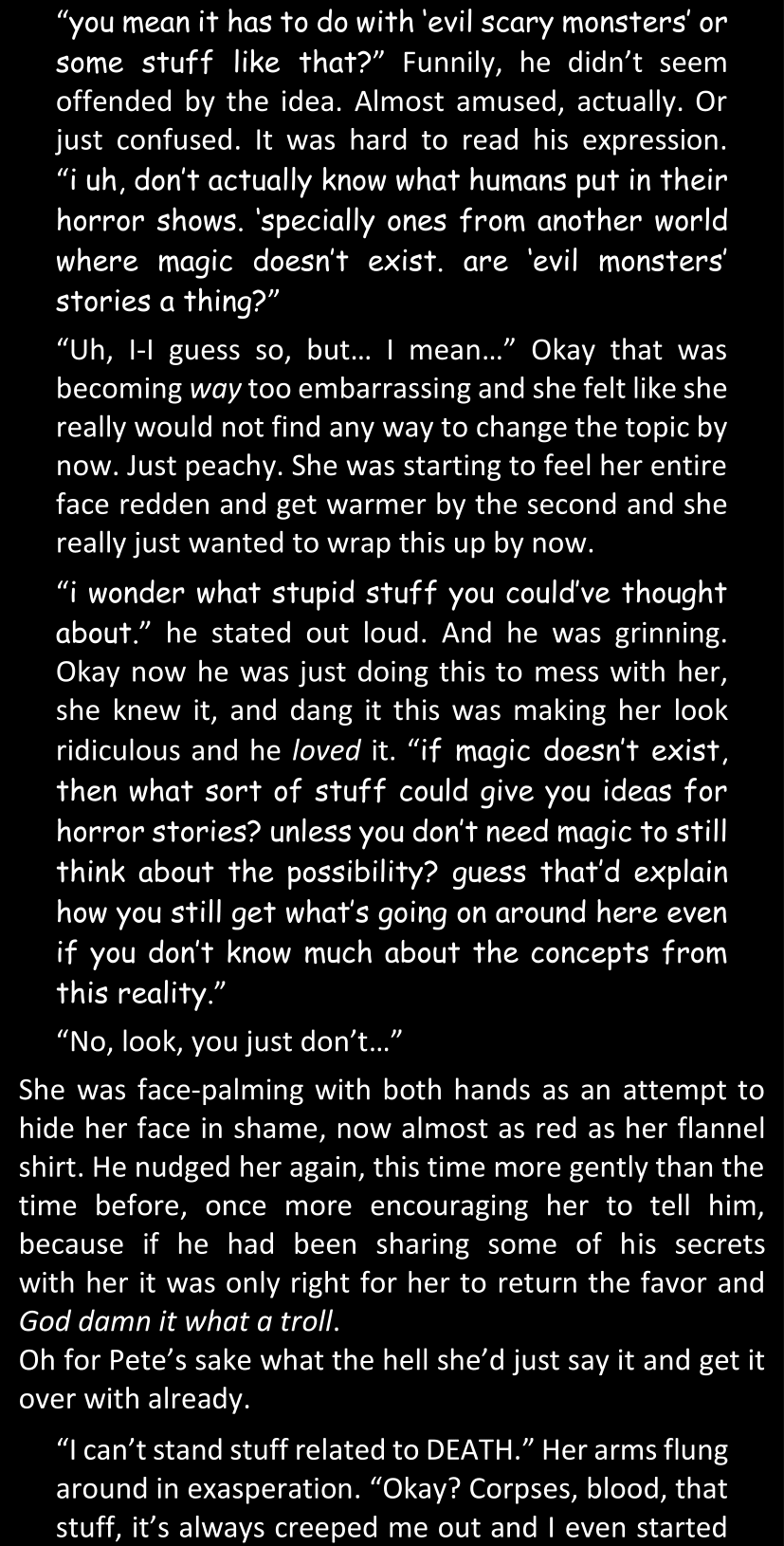 “a’right, maybe the last one was a bit of a stretch.” He rolled his eyes and shrugged overdramatically. Then he paused and his grin expanded. “but don’t tell me it completely left ya in the dark, eh…?”