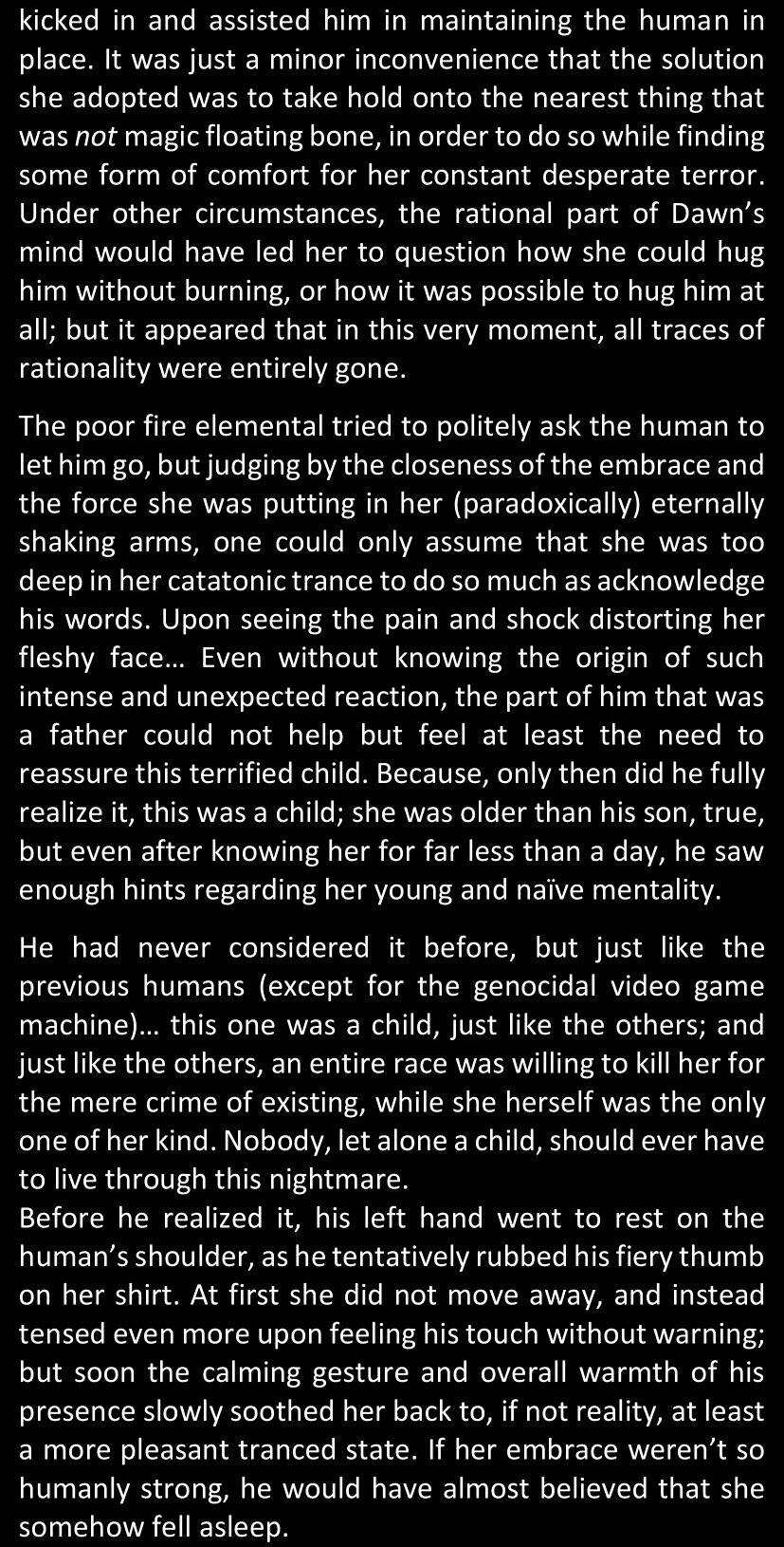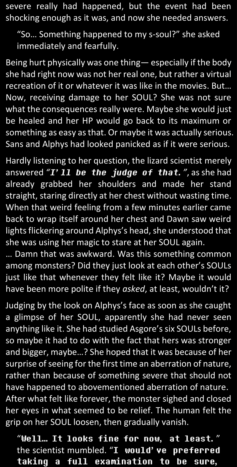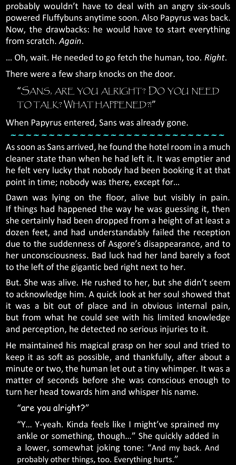 Dawn wakes up in Papyrus’s bed. She is groggy and confused, and as soon as Sans arrives to check on her, her panic attack resumes. She is visibly terrified of Sans and it’s a miracle that Papyrus is able to hug her “even though [he has] no remembrance of what might have happened”, without her screaming or lashing out in response. She still seems very shaken and utterly paralyzed by the feeling of bones, but the soothing magic warmth applied on her soul actually helps her slowly breathe more regularly; once she calms down, she is grateful for the intention behind the embrace (much more than the embrace itself).