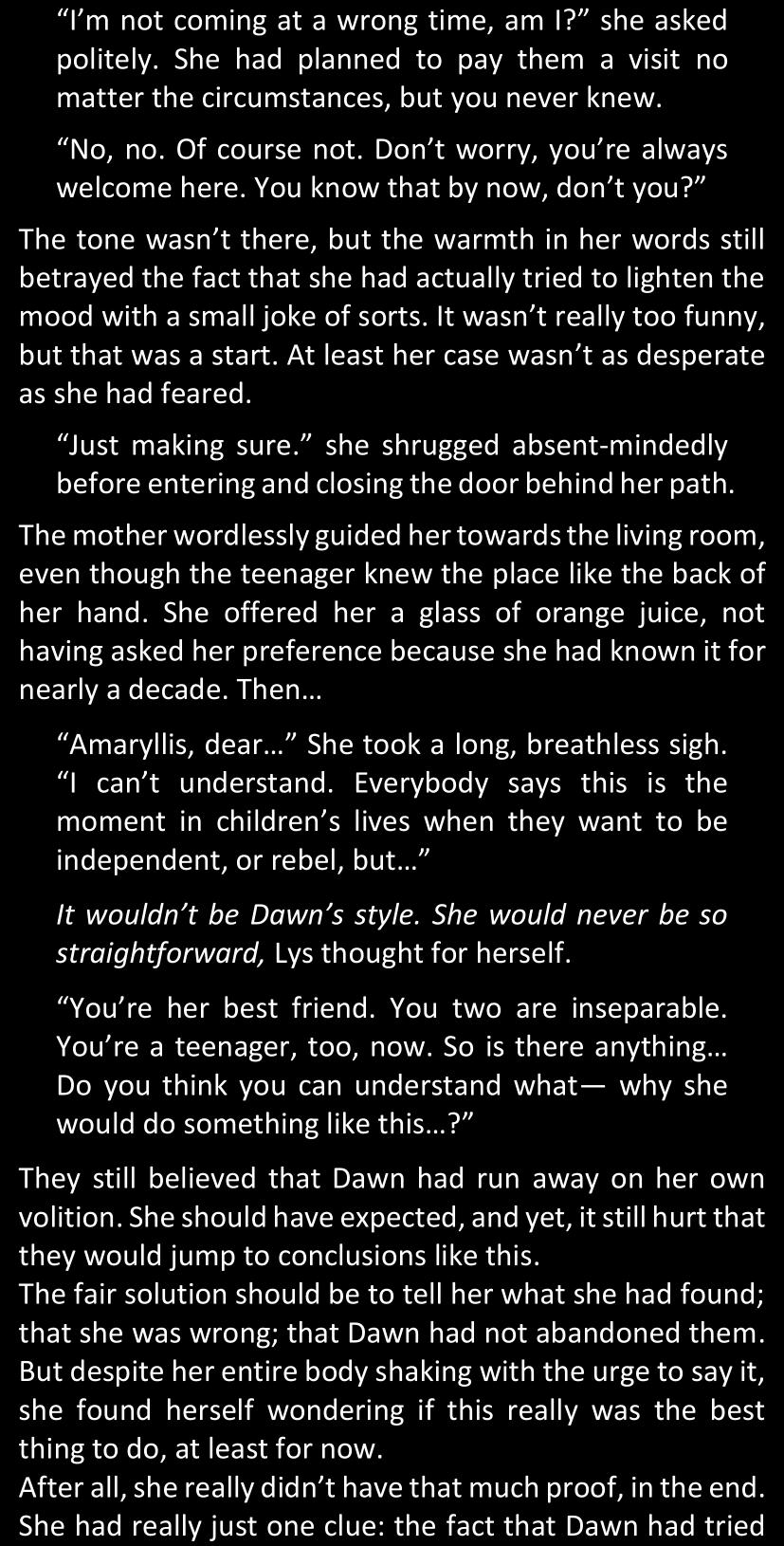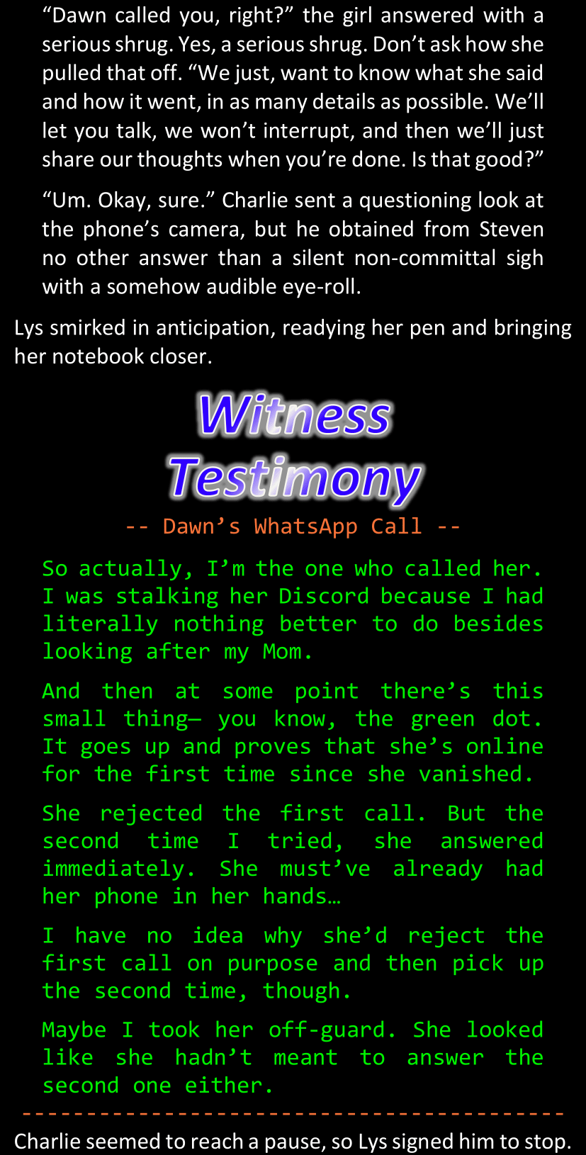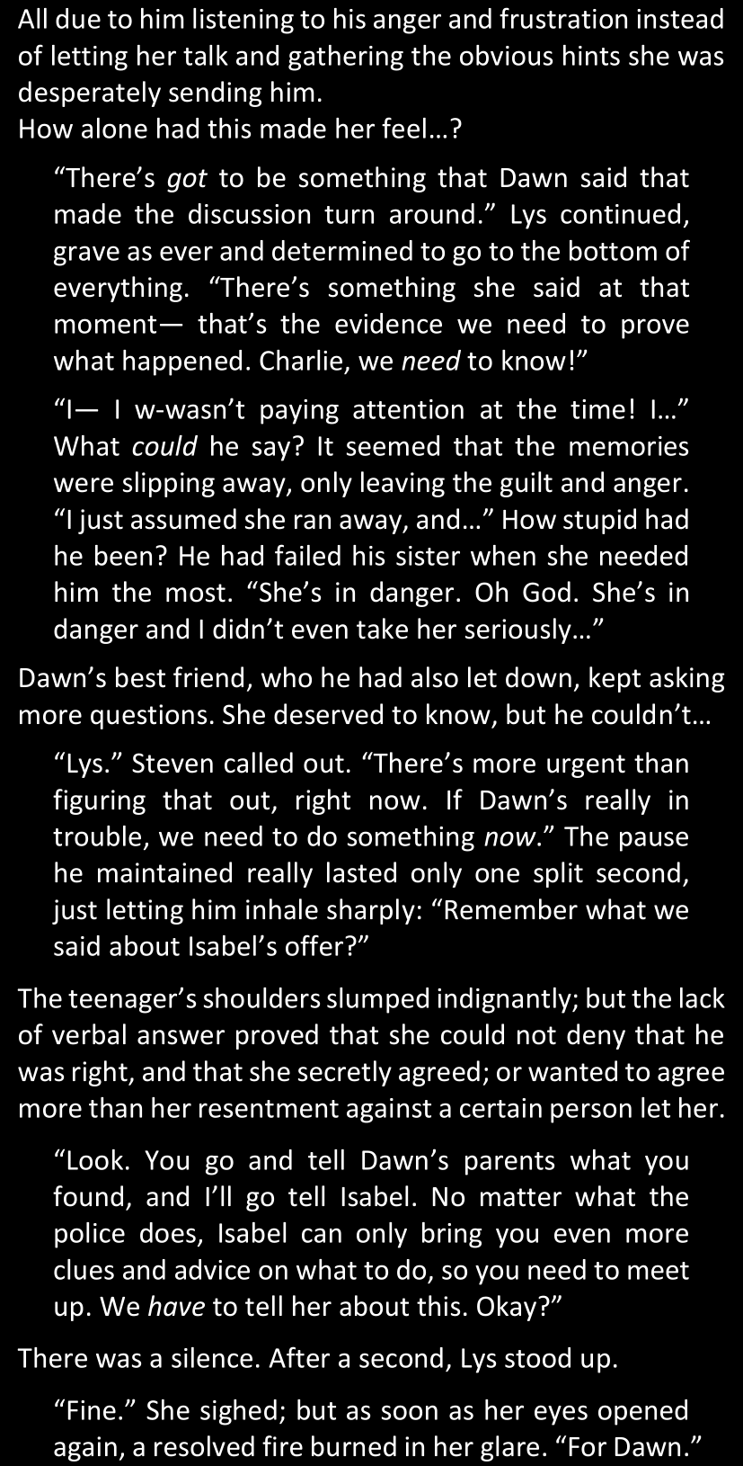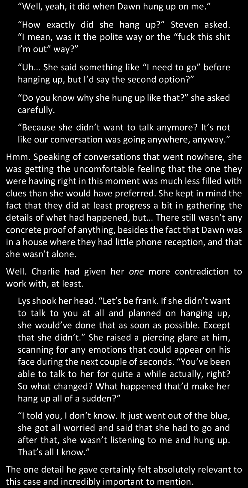 “What you have found so far is enough to convince me, because we both know Dawn personally; but that won’t be enough for the police to link our case with these ones.” (She tapped the screen of her phone.) “However, in case you do find some decisive evidence… Come back to me.”
