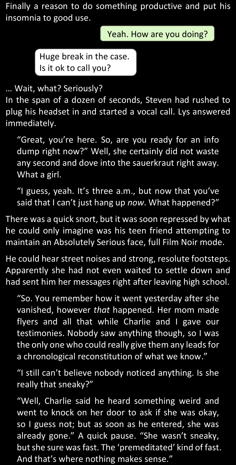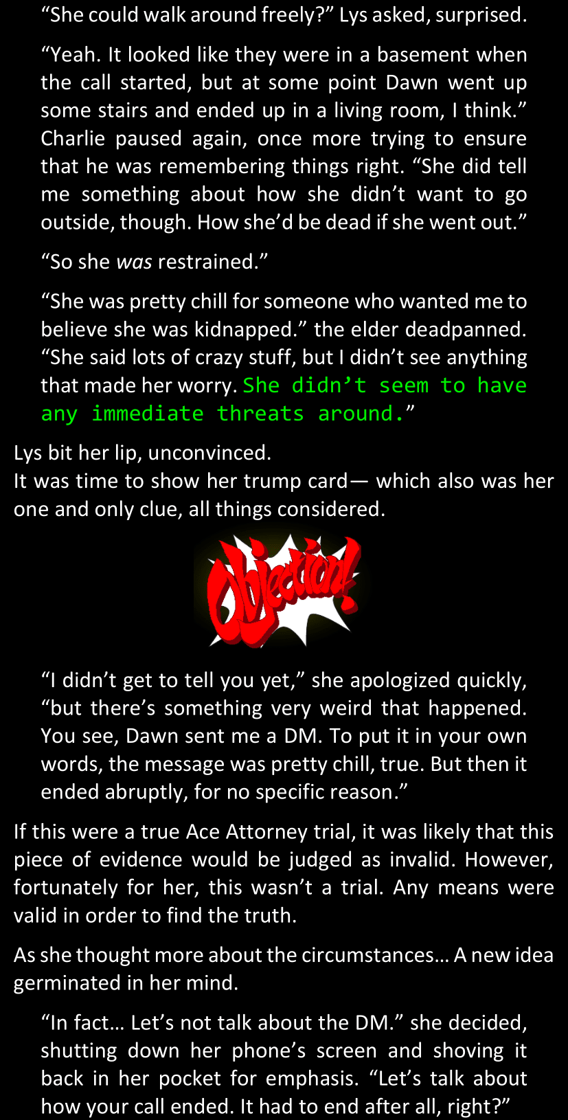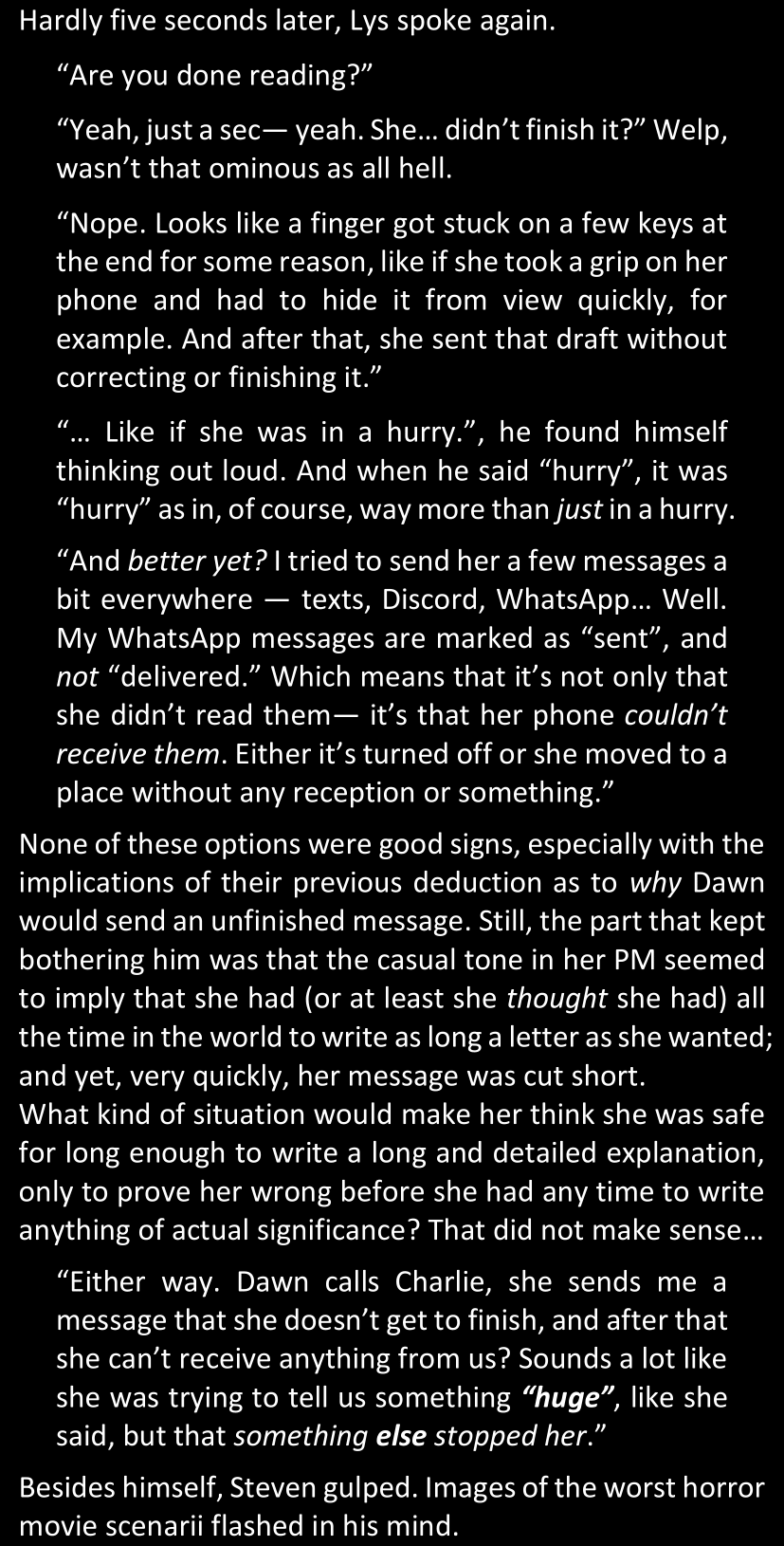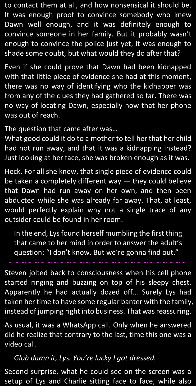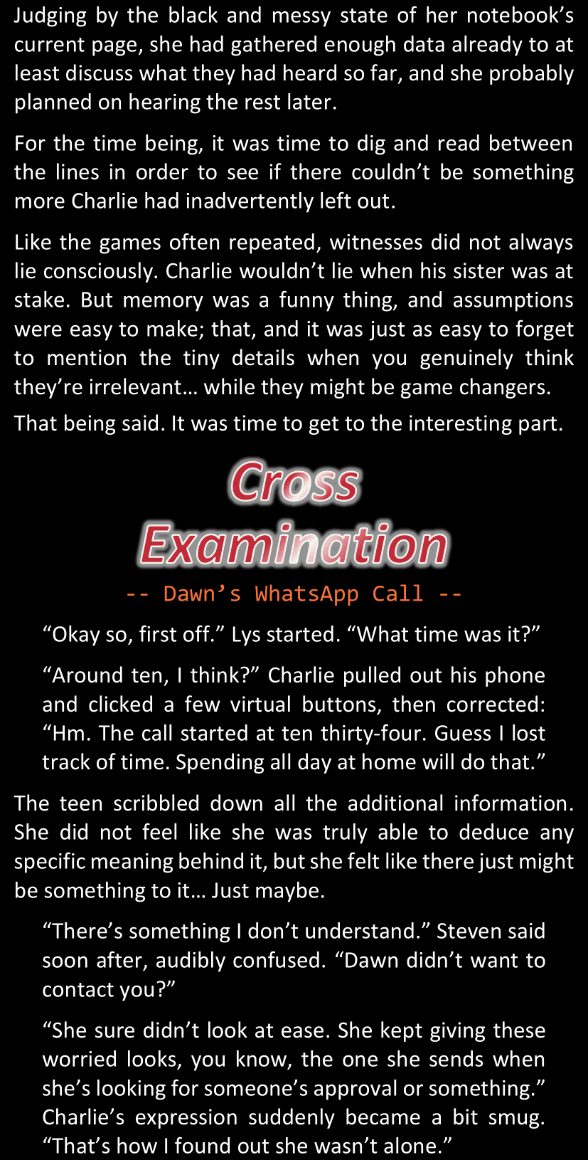 “What you have found so far is enough to convince me, because we both know Dawn personally; but that won’t be enough for the police to link our case with these ones.” (She tapped the screen of her phone.) “However, in case you do find some decisive evidence… Come back to me.”