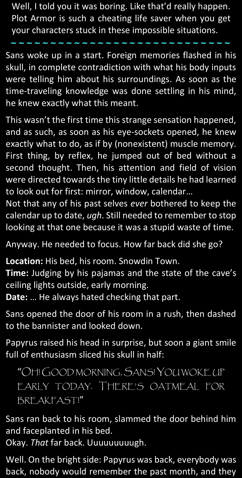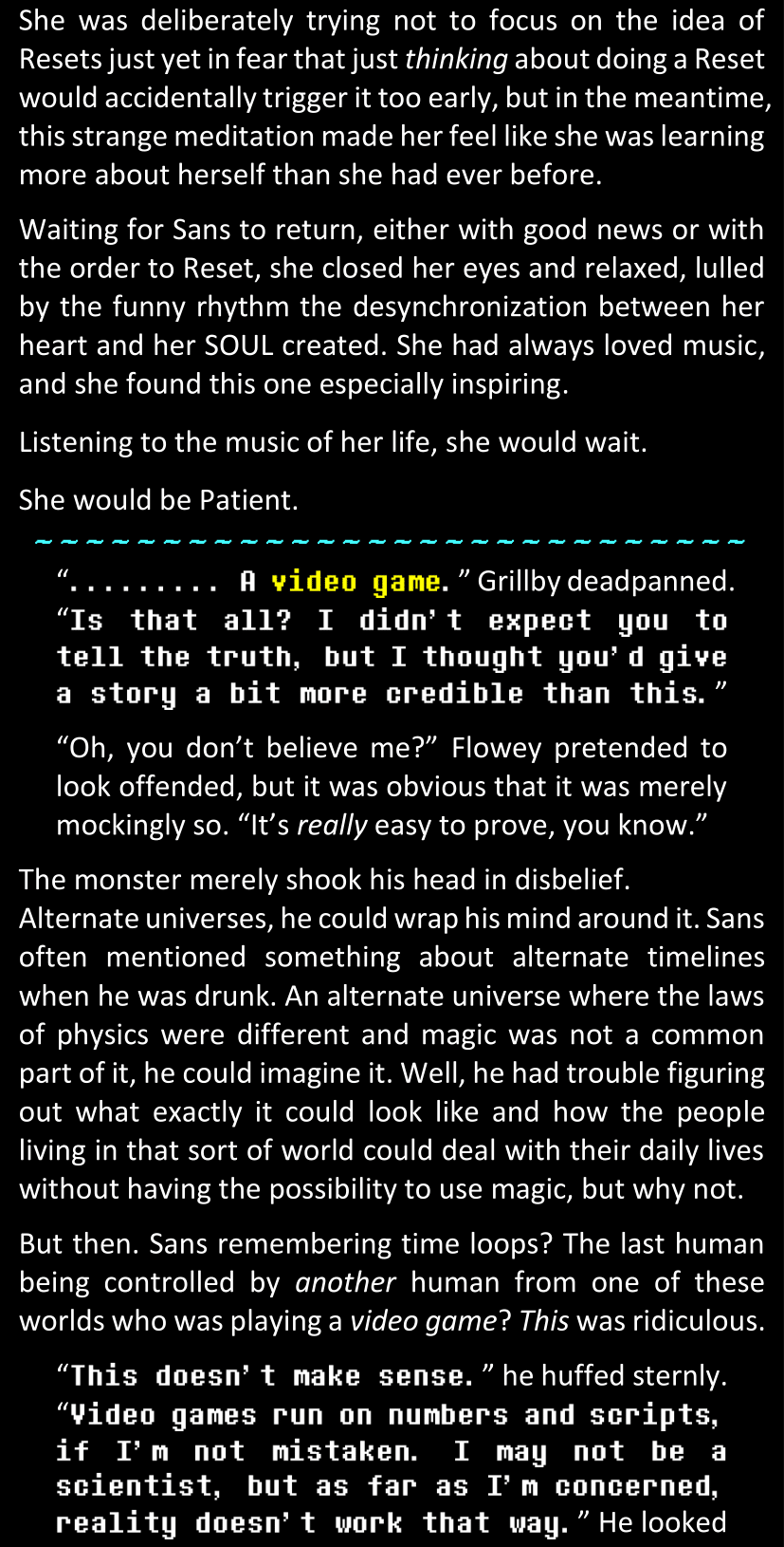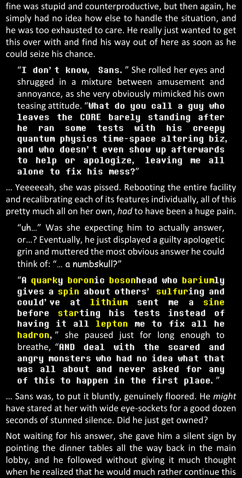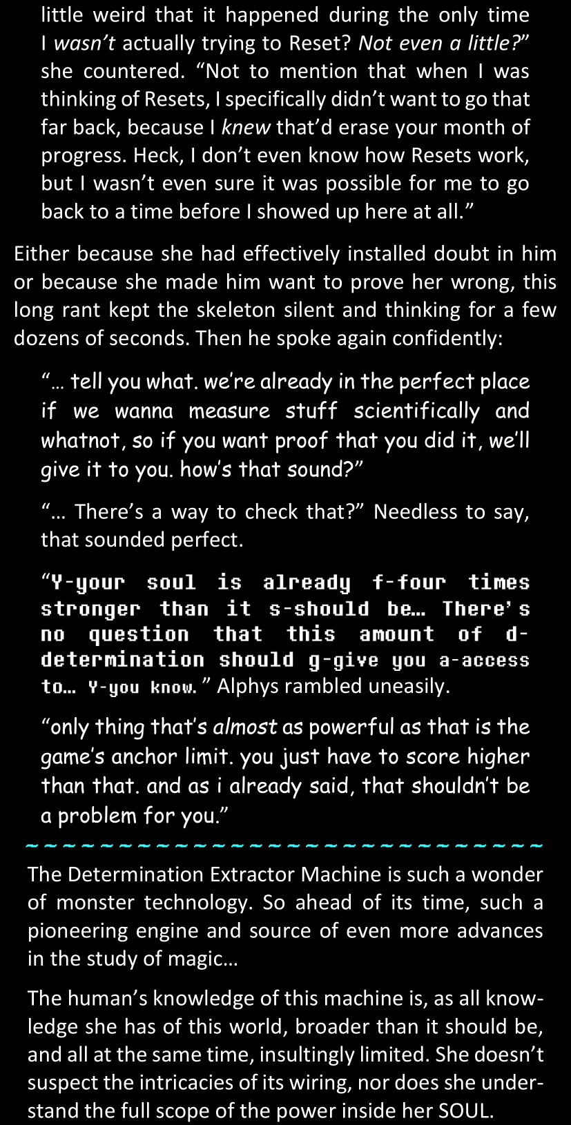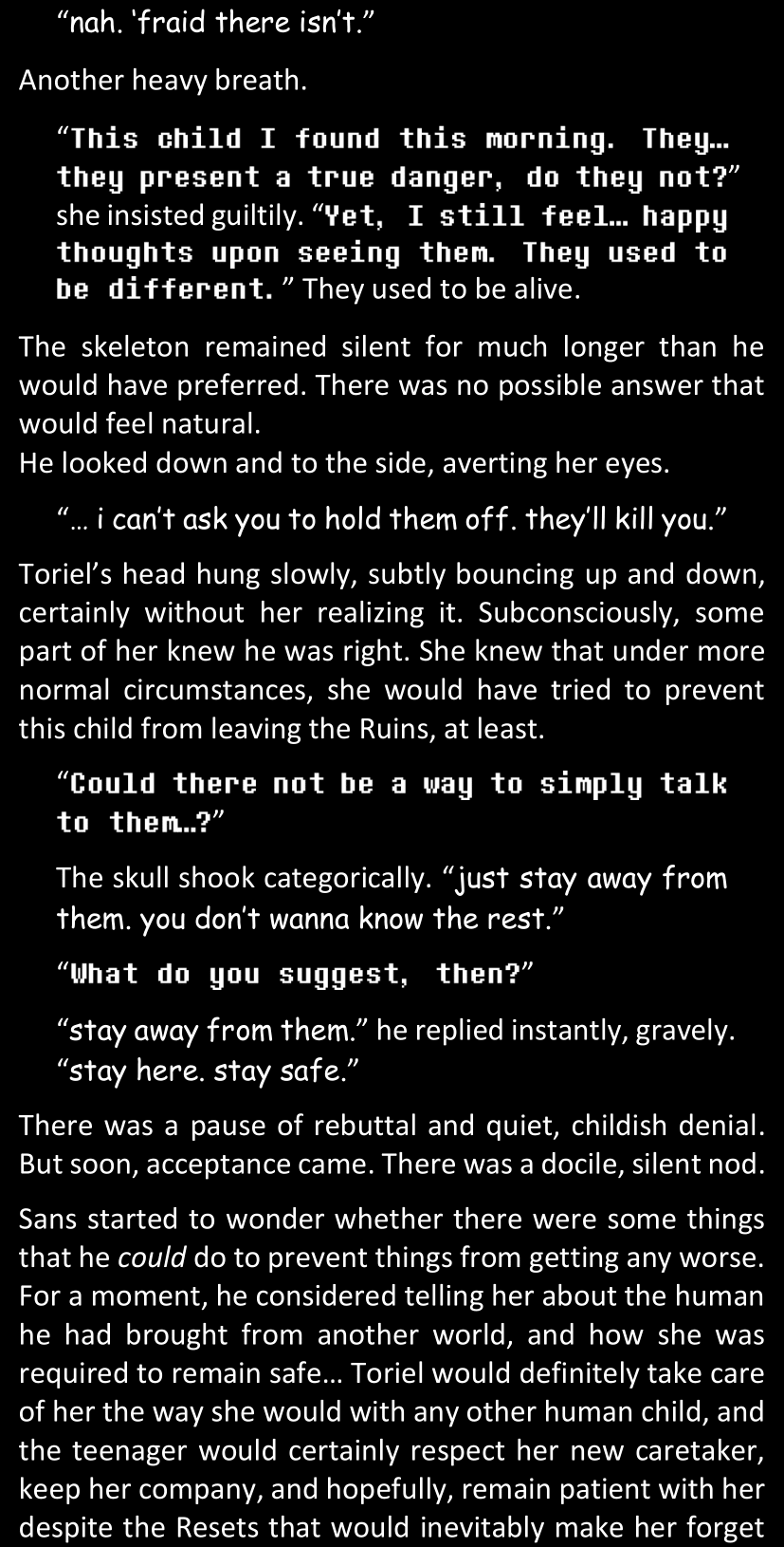 This, simply, was not Sans. There basically was no way. Some random pile of pixels from a simple video game could not magically all of a sudden become corporeal and sentient and be facing her right now in the four dimensions of space and time. She would not discuss that science fact, that was simply out of the question.