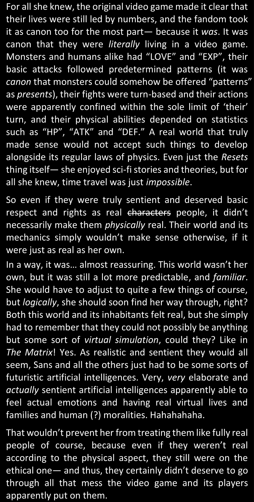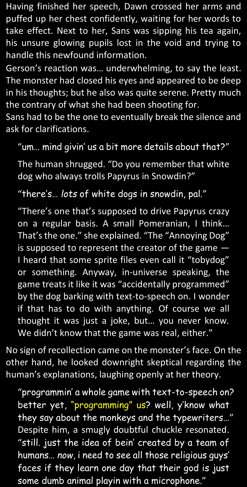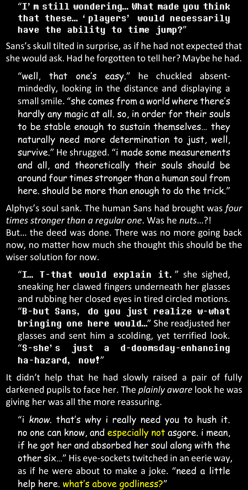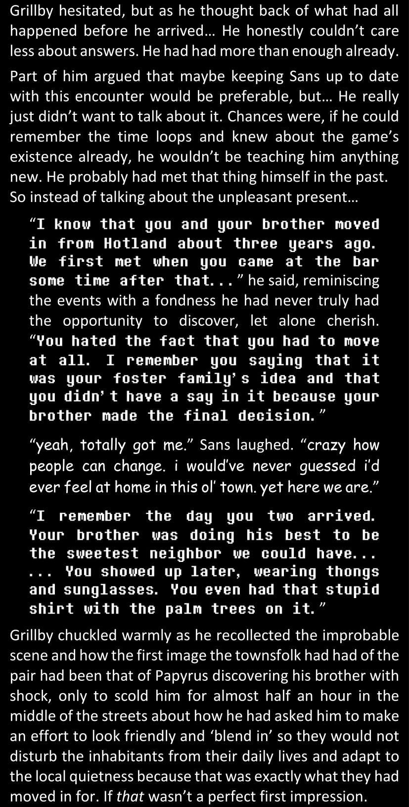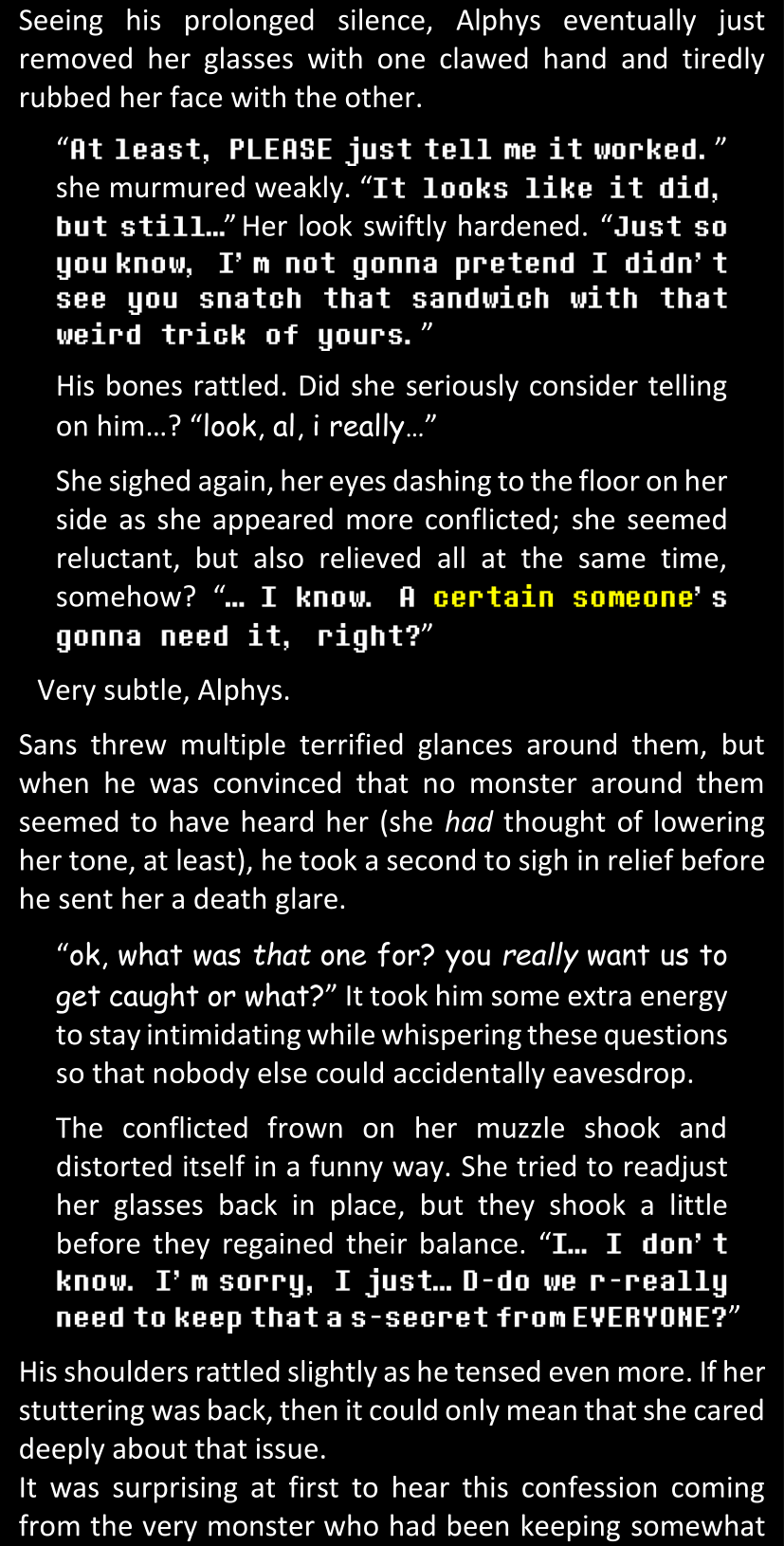 This, simply, was not Sans. There basically was no way. Some random pile of pixels from a simple video game could not magically all of a sudden become corporeal and sentient and be facing her right now in the four dimensions of space and time. She would not discuss that science fact, that was simply out of the question.