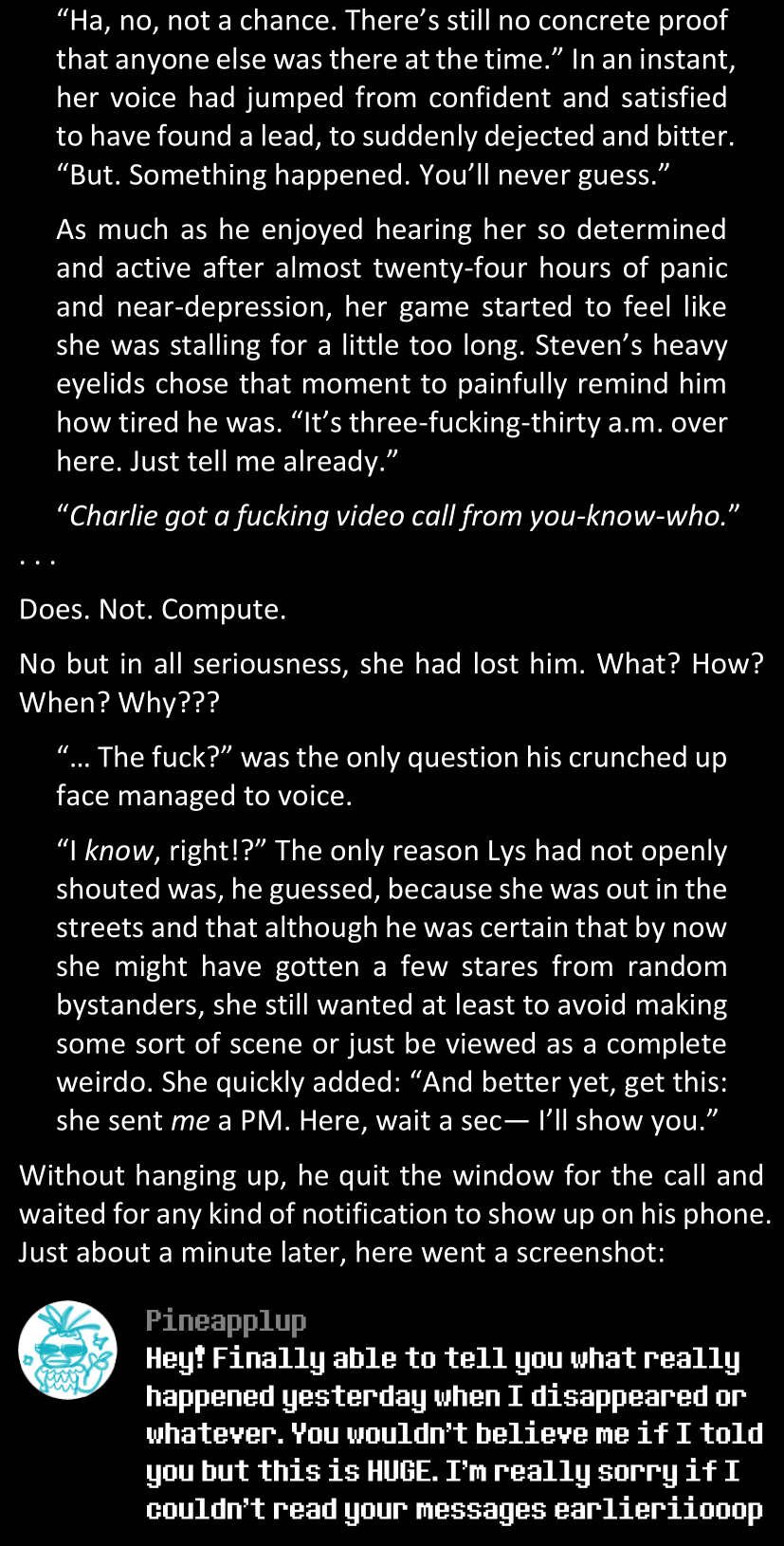 One victim. No clues able to identify any stranger’s presence around the scene; the only traces left belonged to people who were completely expected to pass by the scene regularly, and no connection between these people and the other cases could be made. The victims did not know each other and did not seem to have any sort of connection, not even through remote, one-time acquaintances. Some victims were reported to have disappeared outside of the US, even. Apart from the fact that they had all disappeared under unknown circumstances, that no body could be found, and that they had all left most of their essential belongings behind them, which should have ruled out both theories of running away and suicide, nothing seemed to connect these cases at all. They really only had one thing in common, besides the strange disappearance: they had all left a running computer nearby. The reports didn’t mention which one, but all the victims were playing a video game before disappearing.