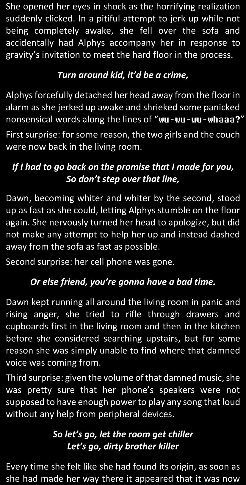 To her surprise, the place right outside the door was just as dark as the room she was in. That helped her make herself less noticeable by hiding in the dark, but sadly, it meant that she would be completely blind as well. Still, she locked her eyes in the direction of the door, trying to keep a mental image of the surroundings and the different objects in the room, for lack of being able to keep sight of them.