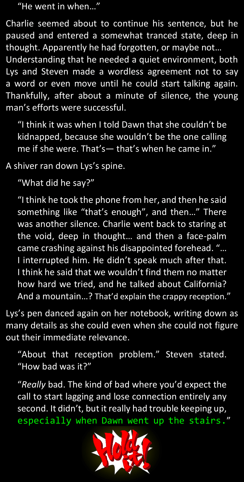 Isabel brings about the possibility that Dawn was indeed kidnapped, because she once overheard her father discussing with high members of the force about some weird case file. But she doesn’t have the details of what the police think or have found out about said case because the subject of other unrelated cases is confidential, and as long as no connection has been made between Dawn’s disappearance and this case file, her father won’t tell her anything. Lys and Steven ponder if it implies that this case file is getting into conspiracy stuff, but Isabel retorts that it’s really just that she’s not in the force and that she really just isn’t supposed to know nearly as much as she already does. Conspiracy stuff or not, the contents of this case file are not supposed to fall into their hands anyway because it’s simply none of their business; at the very least, until they can prove otherwise.