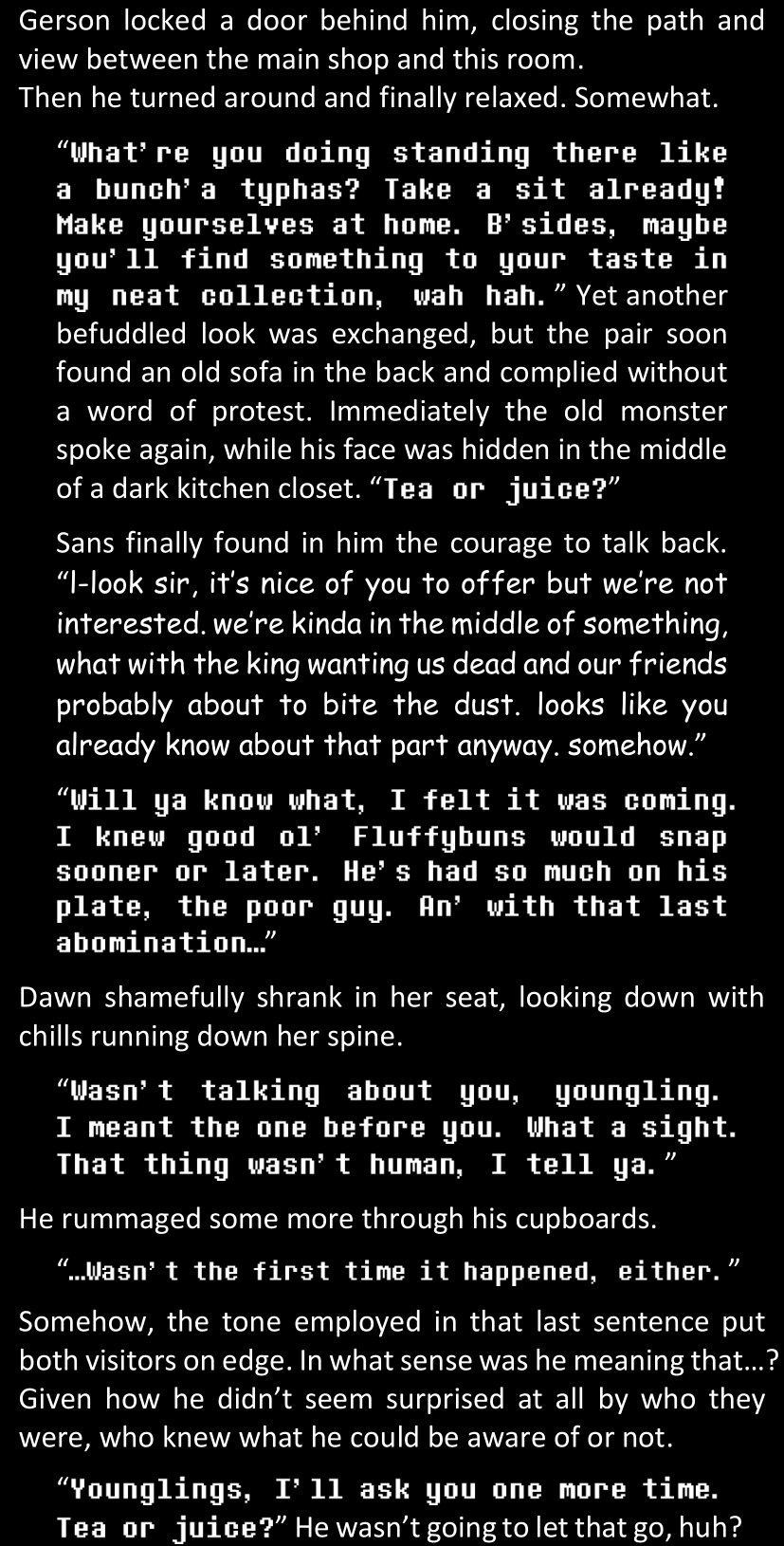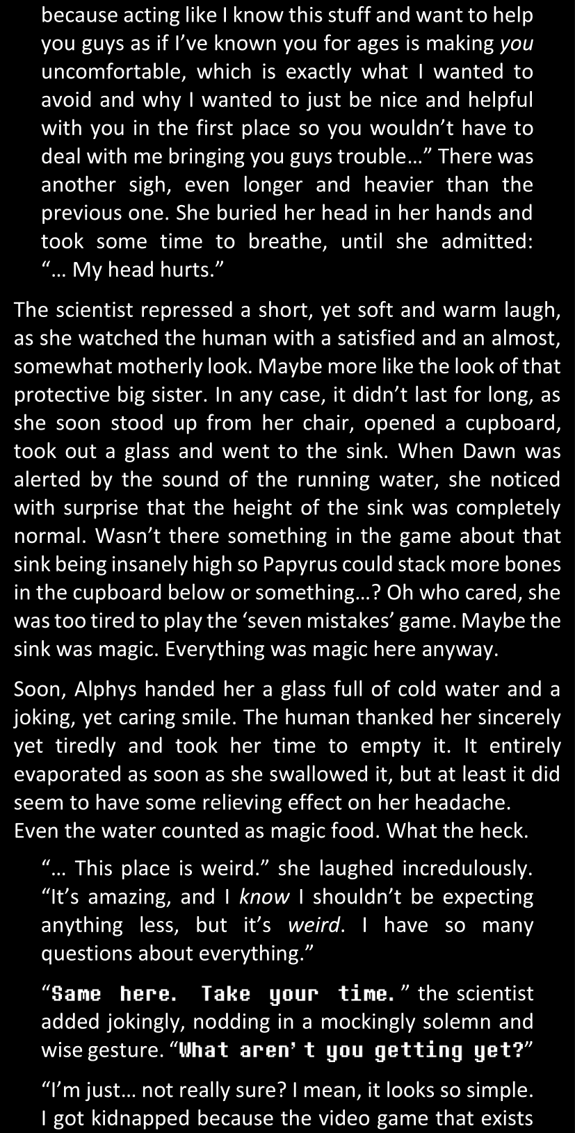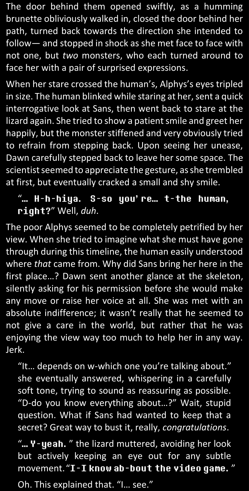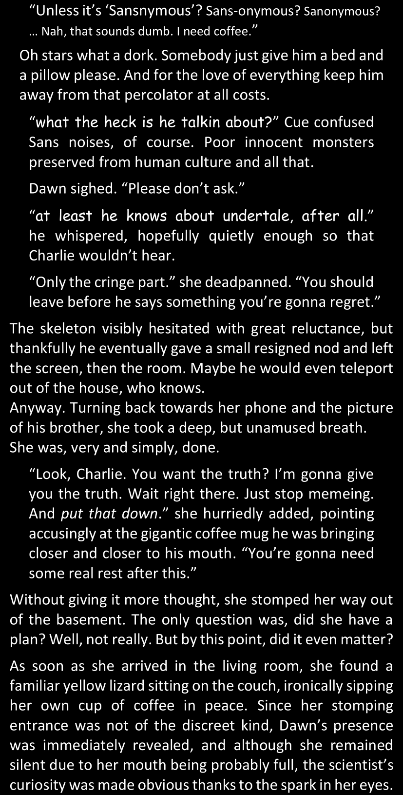 Filled with questions and stuck in a chain reaction where she connects more and more inconsistencies she had noticed between the canon video game and the world around her, Dawn is effectively lost and freaking out until Alphys and Papyrus call her out. Still shaken and confused (and because Alphys and Papyrus assume Dawn’s zoning out is because of either her phobia or her celebrity crush on Papyrus), Dawn doesn’t say anything yet. They enter the house, Papyrus prepares tea, and Alphys explains what she knows of the situation, game etc. Dawn is silent at first, but soon prompted to give details when Alphys’s story contains holes. After a certain point, Papyrus has one specific question to ask: