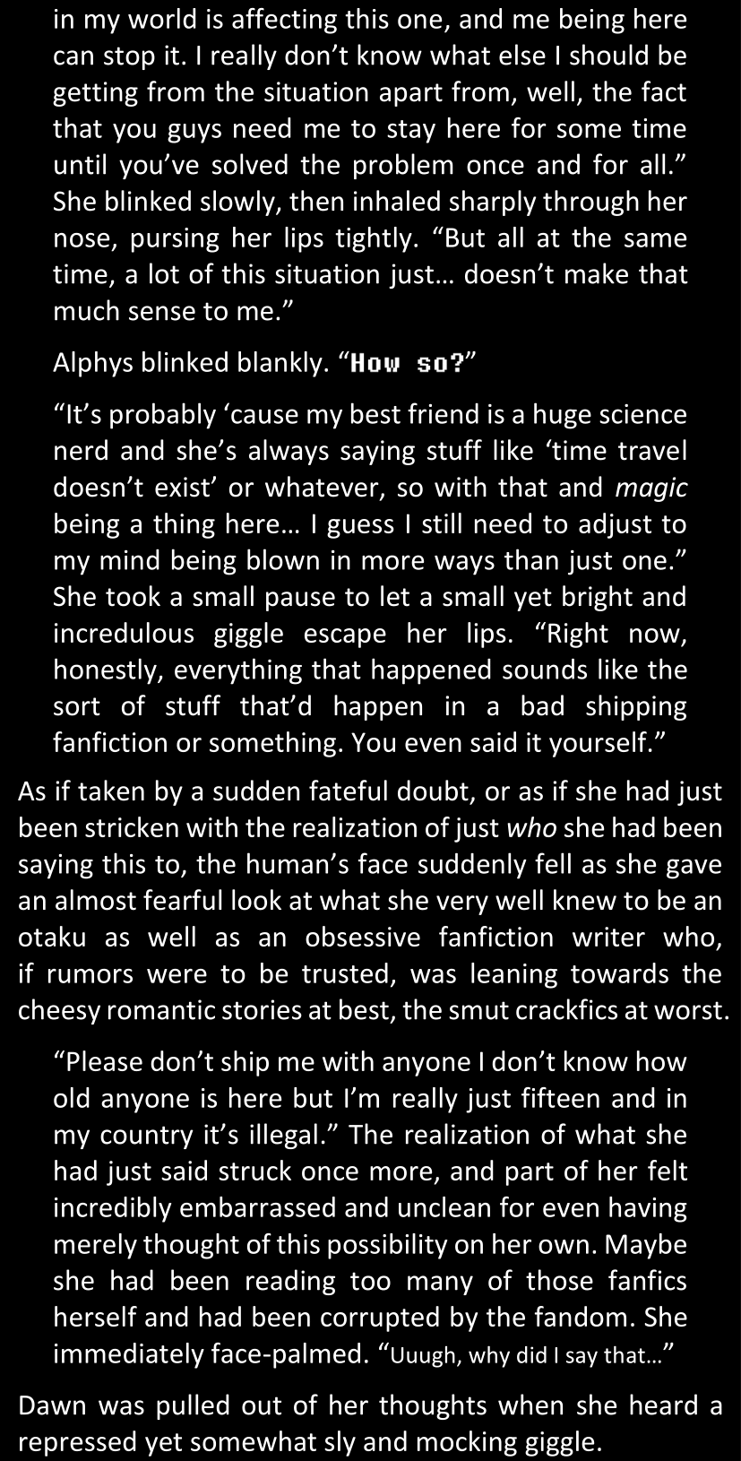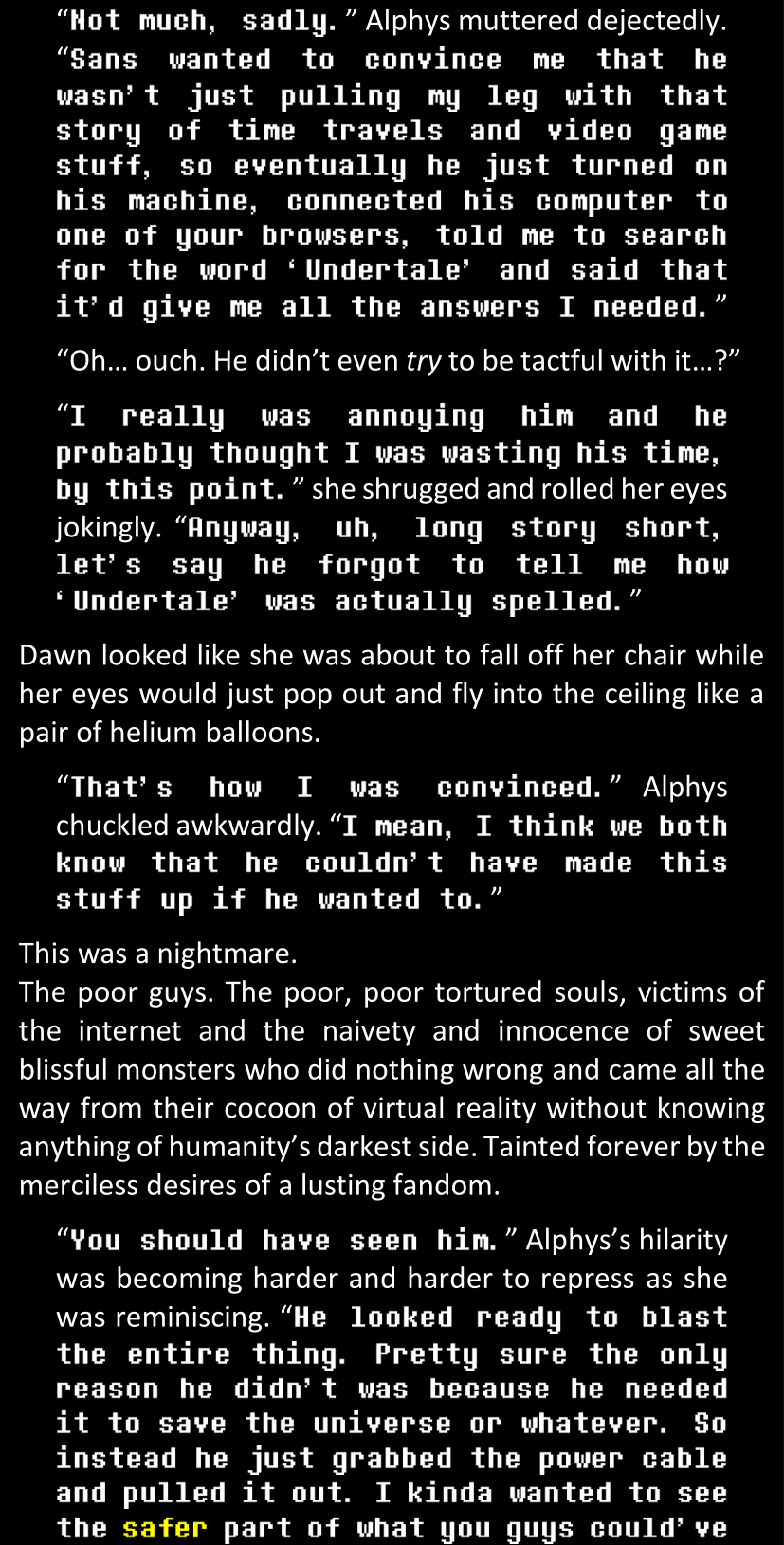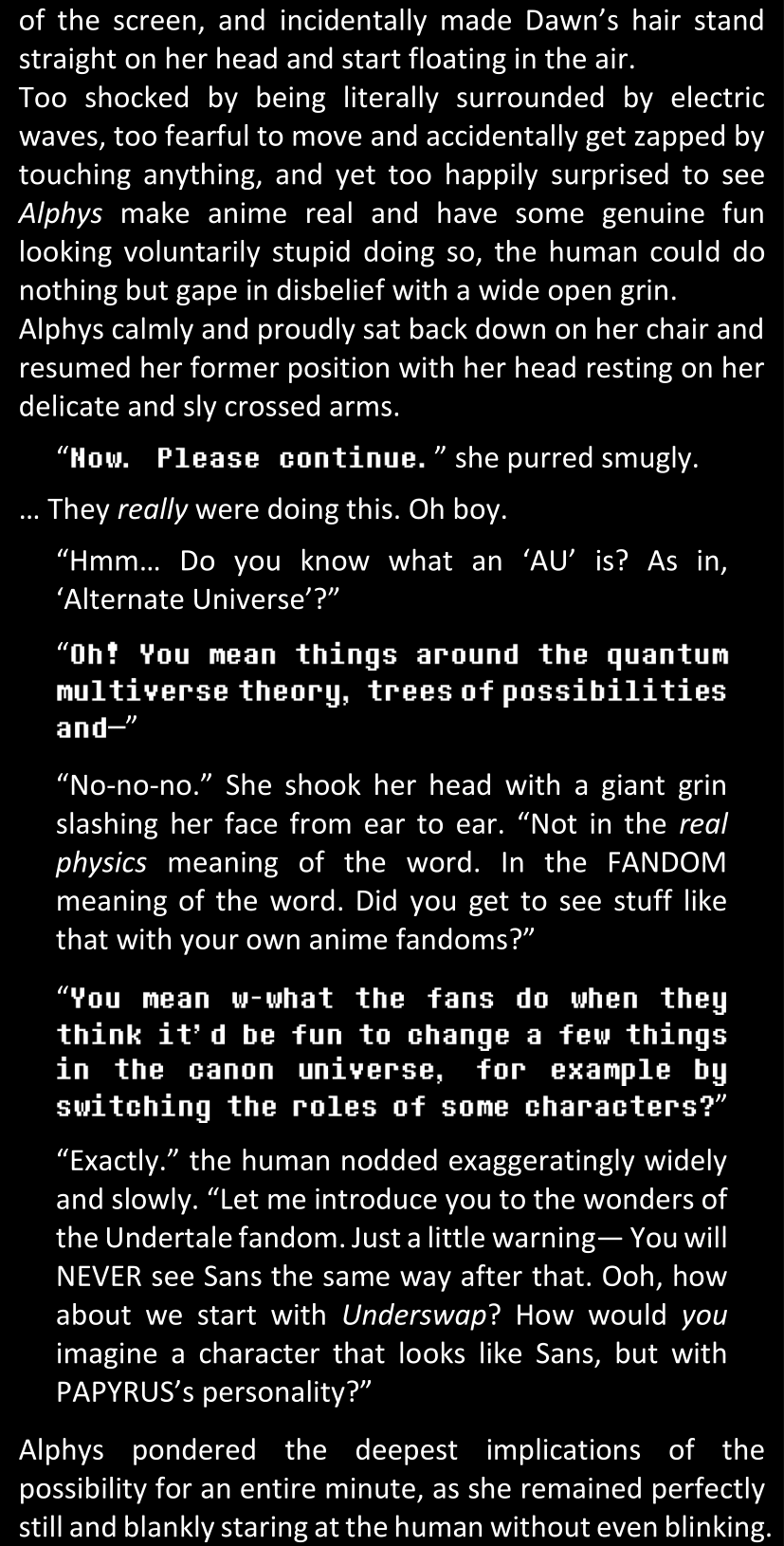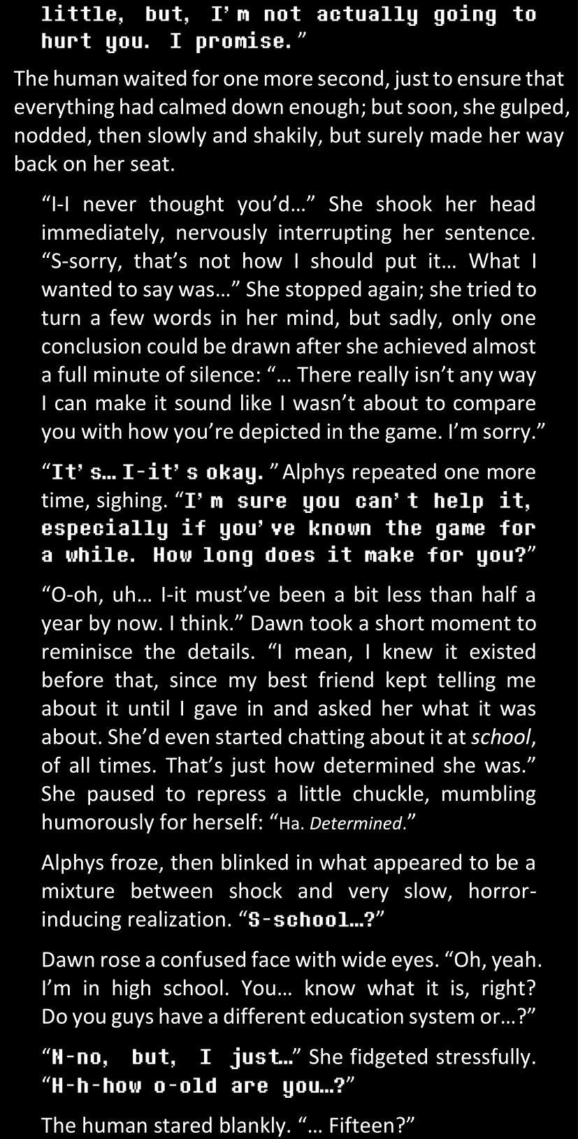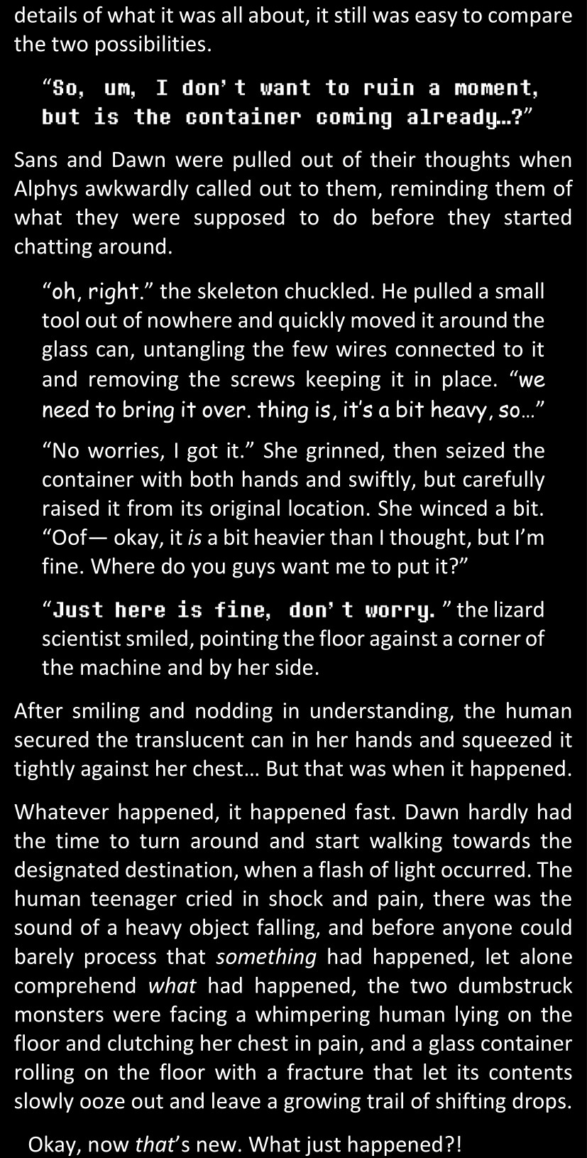 Filled with questions and stuck in a chain reaction where she connects more and more inconsistencies she had noticed between the canon video game and the world around her, Dawn is effectively lost and freaking out until Alphys and Papyrus call her out. Still shaken and confused (and because Alphys and Papyrus assume Dawn’s zoning out is because of either her phobia or her celebrity crush on Papyrus), Dawn doesn’t say anything yet. They enter the house, Papyrus prepares tea, and Alphys explains what she knows of the situation, game etc. Dawn is silent at first, but soon prompted to give details when Alphys’s story contains holes. After a certain point, Papyrus has one specific question to ask: