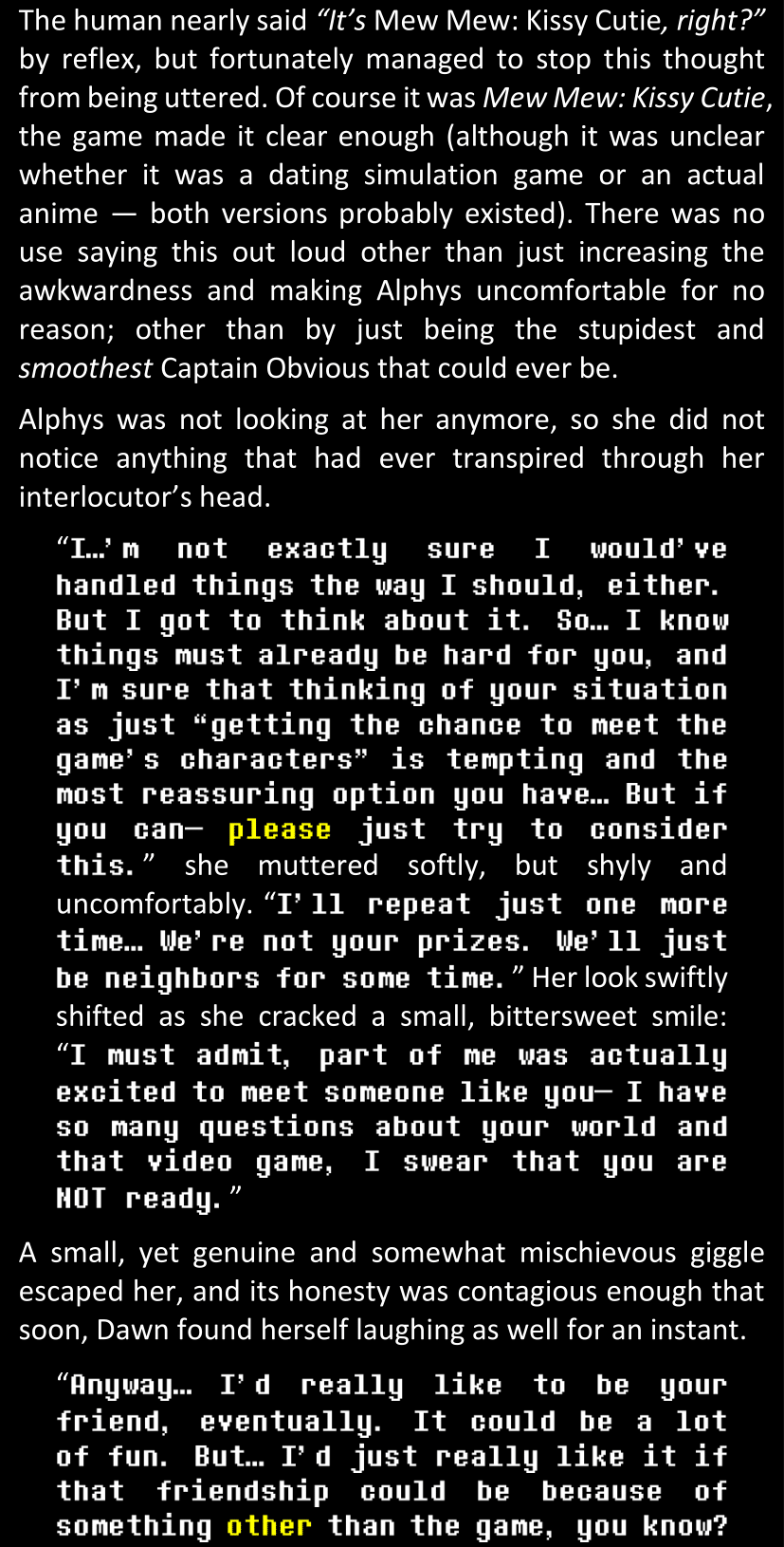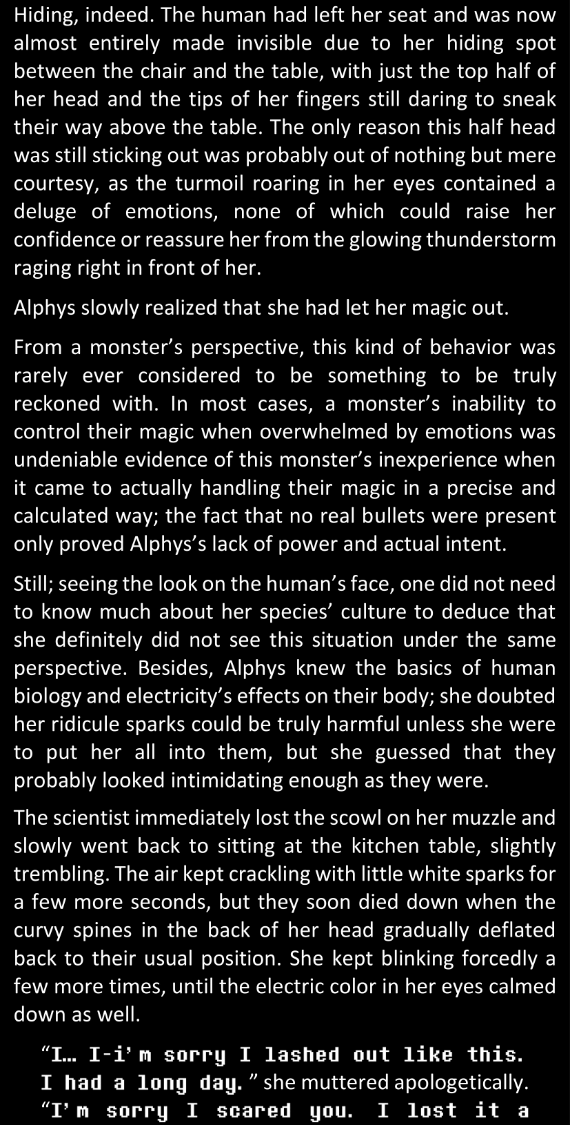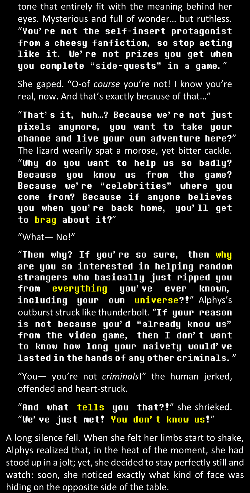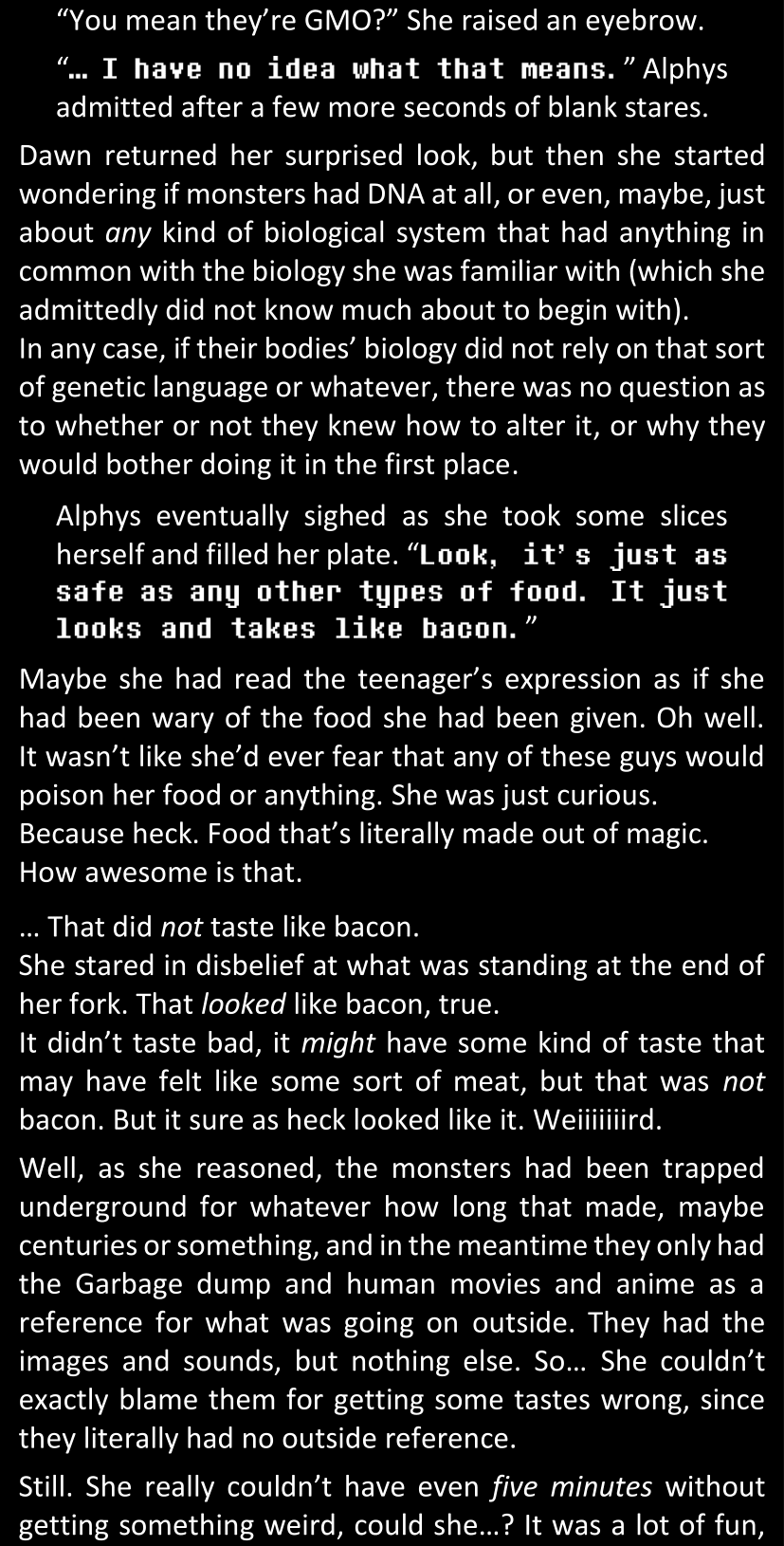 Filled with questions and stuck in a chain reaction where she connects more and more inconsistencies she had noticed between the canon video game and the world around her, Dawn is effectively lost and freaking out until Alphys and Papyrus call her out. Still shaken and confused (and because Alphys and Papyrus assume Dawn’s zoning out is because of either her phobia or her celebrity crush on Papyrus), Dawn doesn’t say anything yet. They enter the house, Papyrus prepares tea, and Alphys explains what she knows of the situation, game etc. Dawn is silent at first, but soon prompted to give details when Alphys’s story contains holes. After a certain point, Papyrus has one specific question to ask: