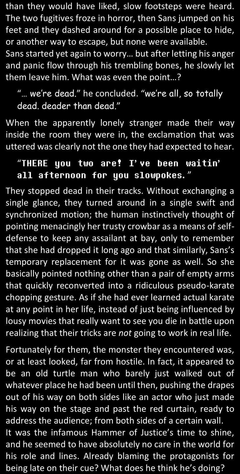 She quickly stared at what appeared to be a living skeleton, rising and lowering repeatedly her gaze down to all the details she could perceive. Despite his still being pretty much hidden in the distant shadows, far away from the silly little Trustworthy Flashlight’s brightness now that it was not focused on his face anymore, she immediately noticed the trademark blue hoodie that she could have recognized anywhere. And his short pants. And the bones. She did not want to focus on the bones. But still, she immediately realized that she perfectly knew who this was.