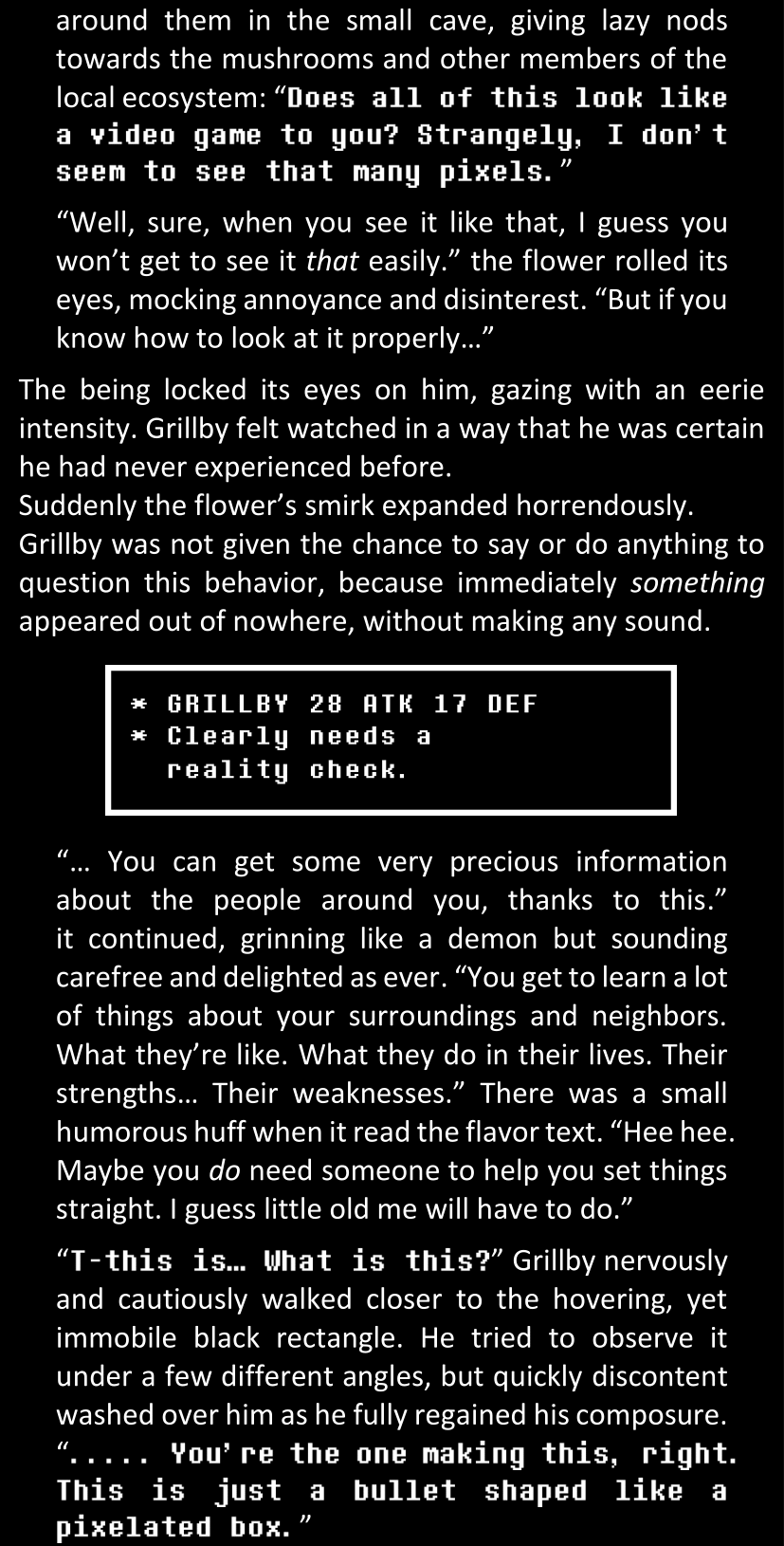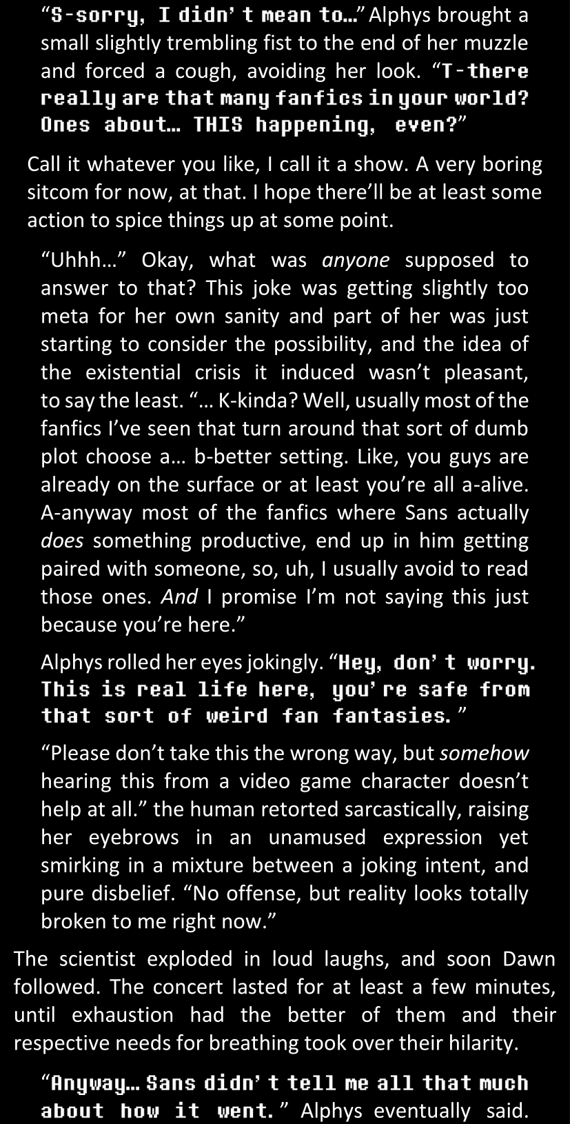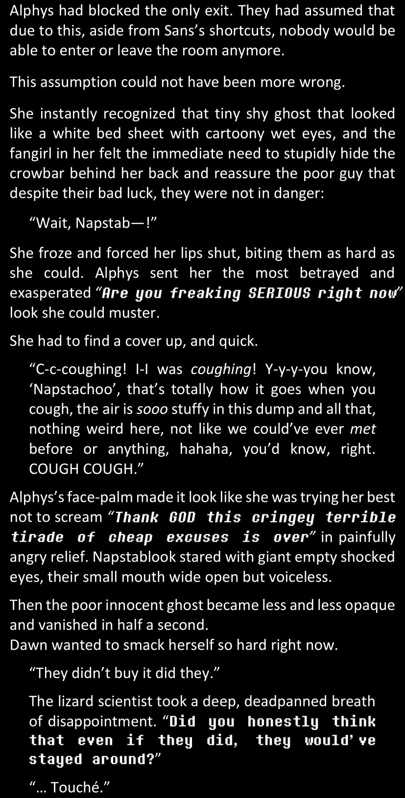“… Ha. That was a really good impression of Sans.” she eventually uttered in a voice that sounded much less confident than she had intended to. “Also his lab. Honestly, I’d almost buy it if it weren’t for a few details. Like, you know. The fact that he’s not real. Just saying.”