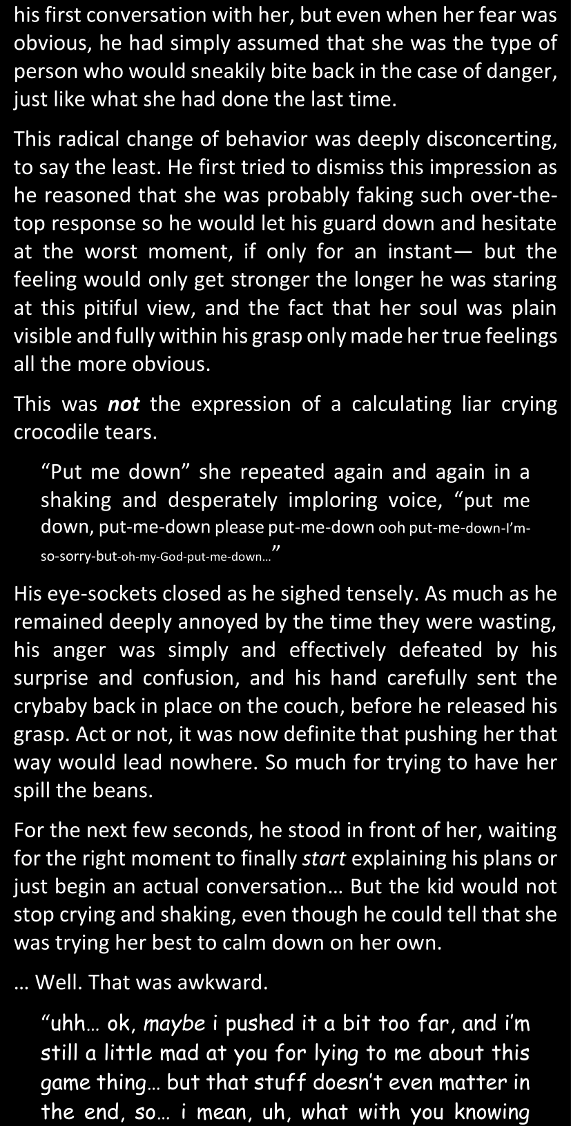 Well, on second thought, no matter what reasons she could think of, that whole mess would have just been unnecessarily overcomplicated and frustrating to prepare, in comparison with the results they would have got anyway. For an instant she almost considered pretending she actually fell into his trap, and improvising some kind of ‘roleplay’ or something out of pity, but she quickly felt very uneasy about it. She had been kidnapped after all. There was no room for jokes with your kidnapper.