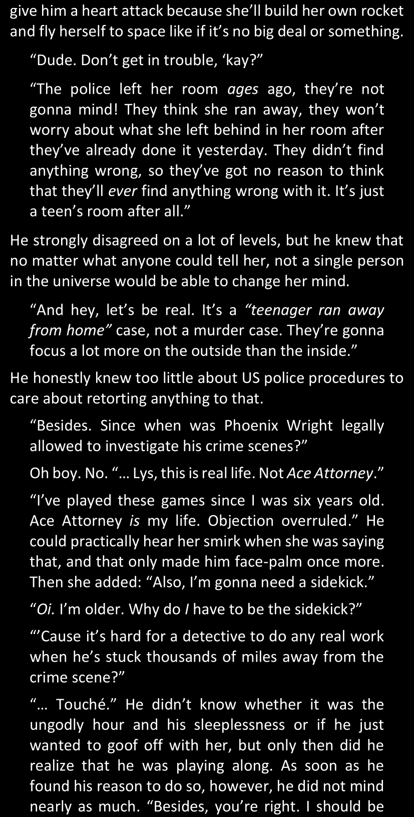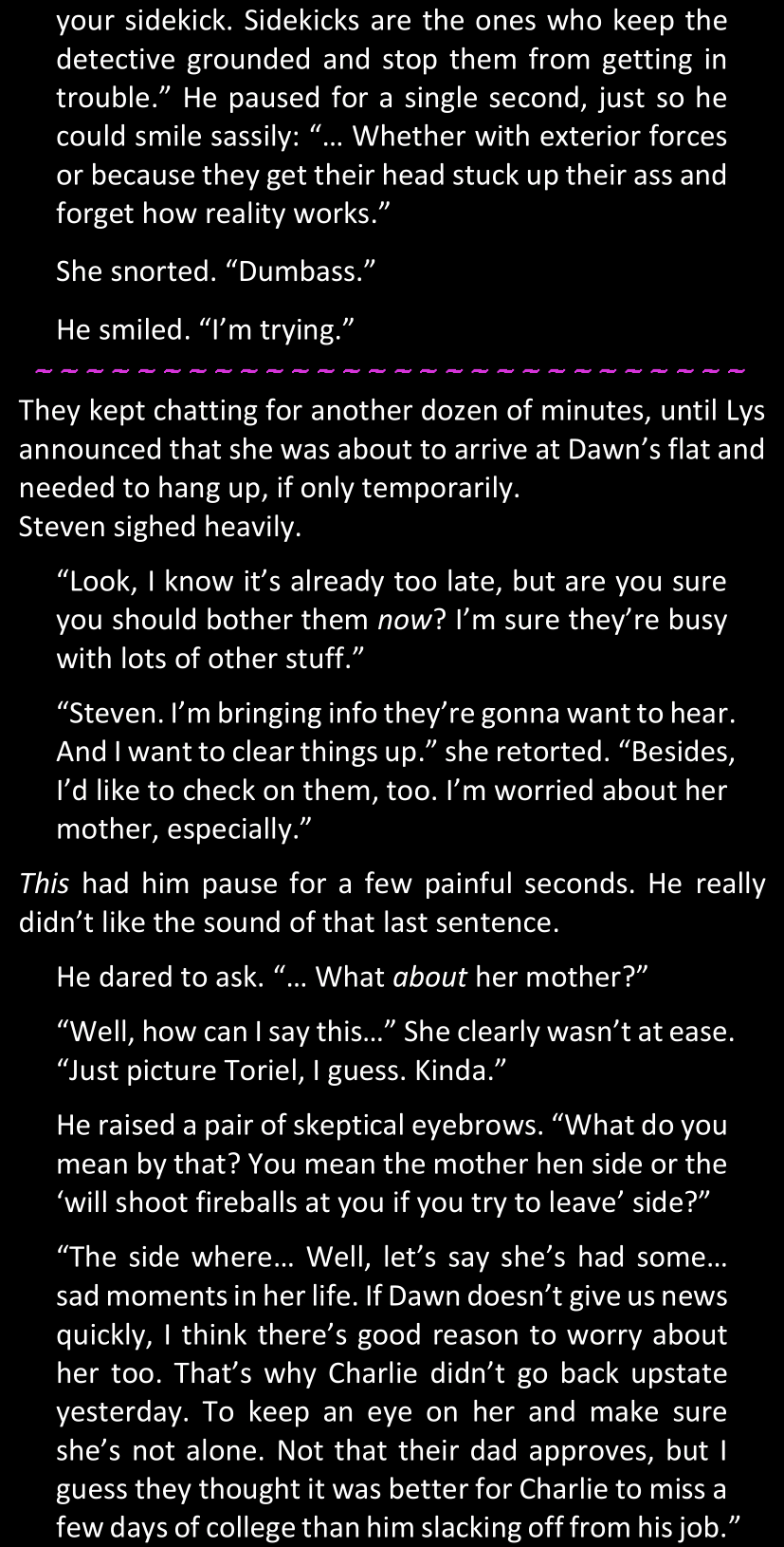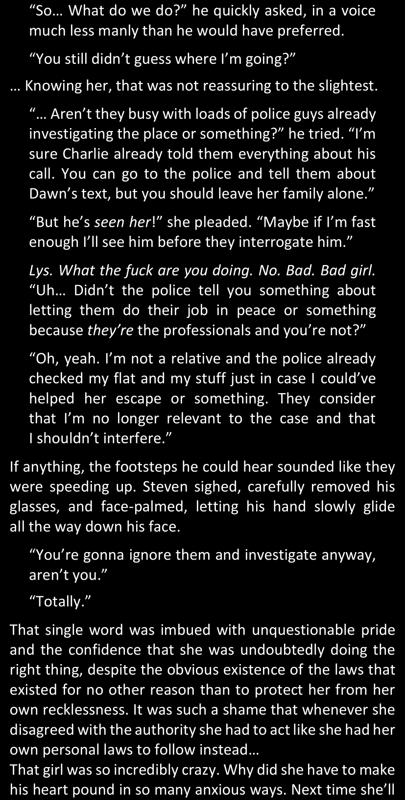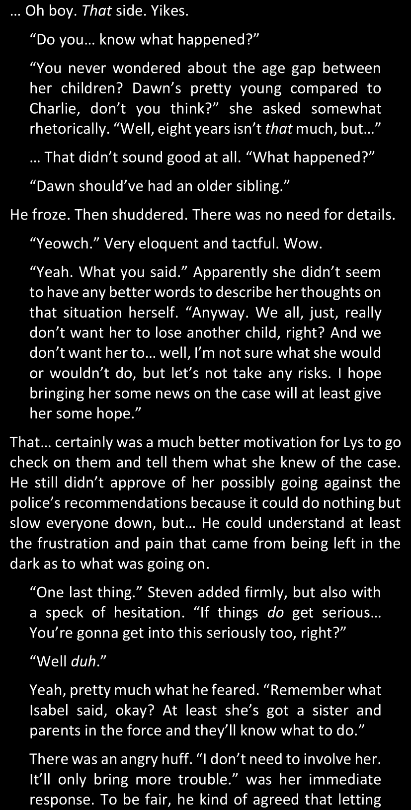 And yet… Isabel looks around them warily, then shows Lys a list of photos she took on her phone. The images are blurry and don’t show much, but it’s easy to deduce that they are some excerpts from the case file she has been mentioning, and that she definitely took those photos without her father’s or the police’s approval. Lys may or may not make some witty remark and say that she now has some blackmail material over Isabel since she could get in a lot of trouble for having taken those pictures, but Isabel is unfazed and claims she can do the same to her; none of them were seriously thinking of blackmailing the other, but they made the remark just for the sake of sounding smarter than the other. If one reads between the lines between those lines, Steven thinks that maybe it’s a very, very elaborate and edgy way of saying “thank you” and “you’re welcome.” Somehow.