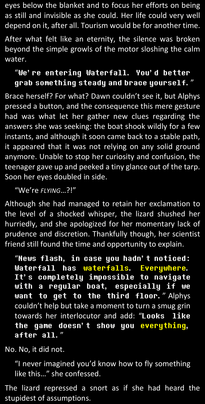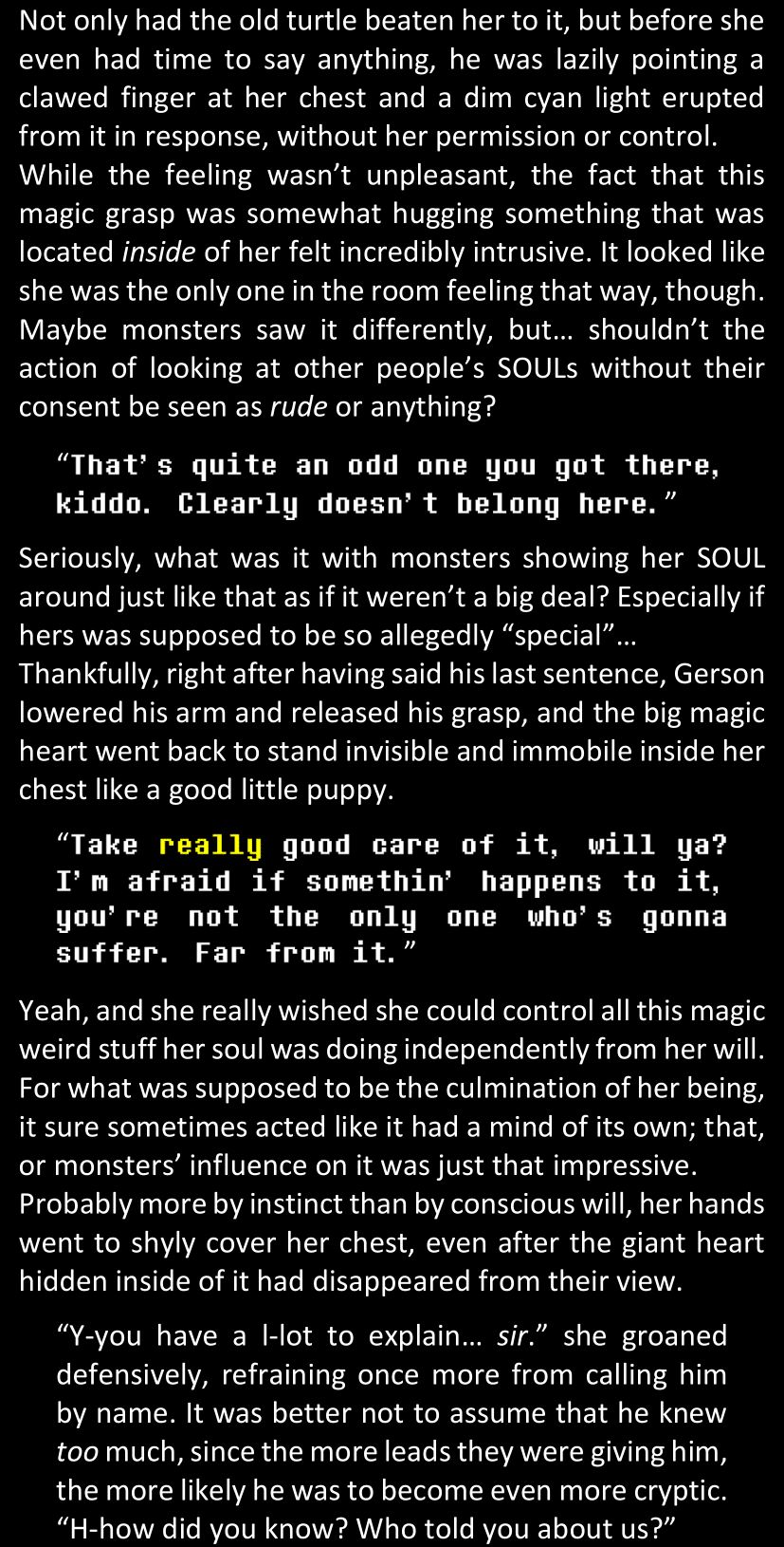 (On a more anecdotical note, Dawn is once more surprised to see that Papyrus was using magic on her soul while hugging her; but it’s the moment when she learns that it’s literally just a “magic hug” and that monsters do it all the time. The only difference with her is that since she is a human, the only part of her body that reacts to the hug is her soul, instead of her entire body. Papyrus understands that it made Dawn uncomfortable and promises not to do it again (as long as he can remember at least), but he warns Dawn that monsters will sometimes do this “magic hug” literally as a way to greet other people, old and new, and that therefore she is likely to have it happen many other times in the future. Dawn muses that this might be why encounters with the player are so frequent: maybe monsters just see a traveler and want to say hi, only to realize that it’s a human upon noticing their soul.)