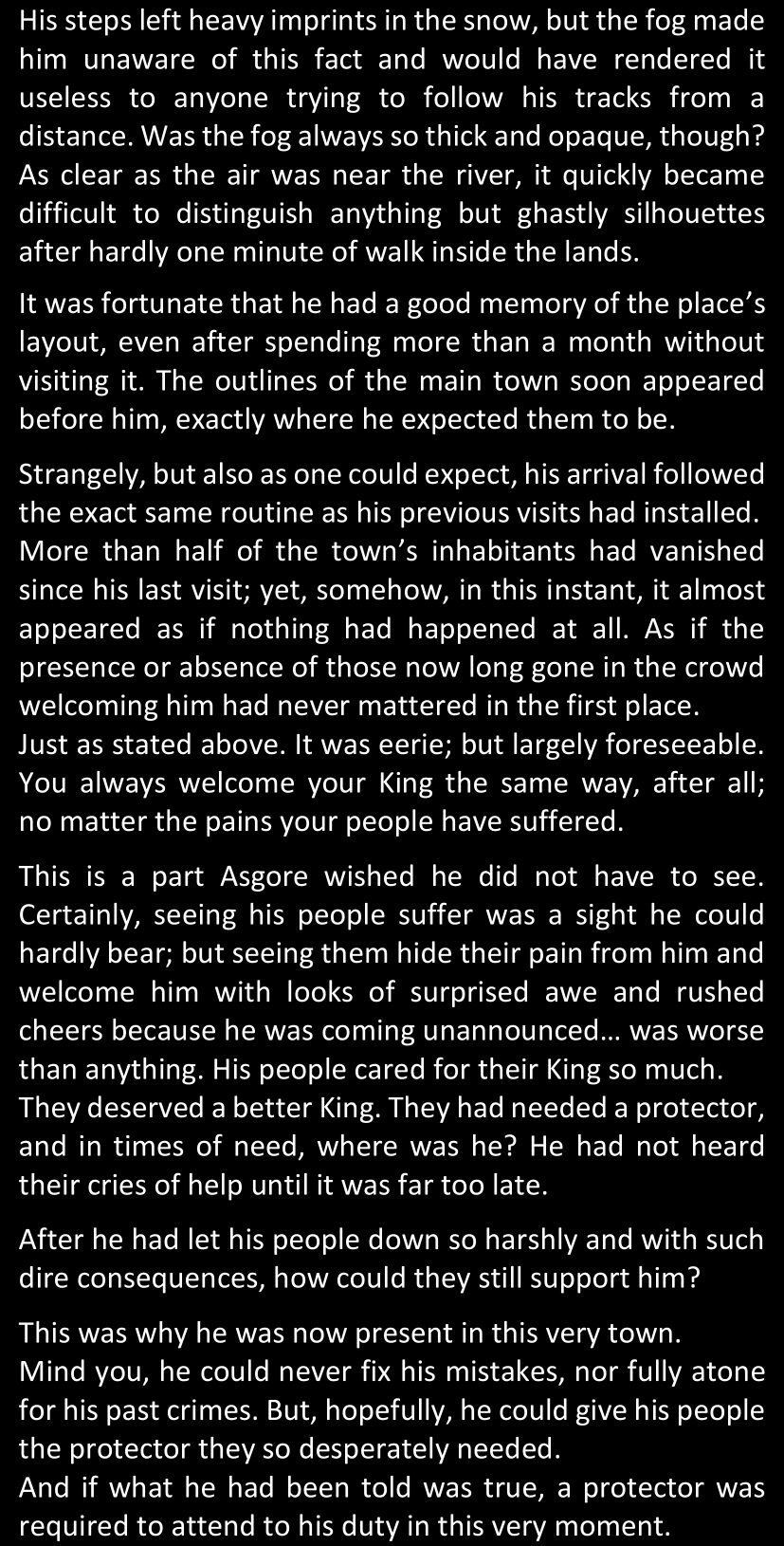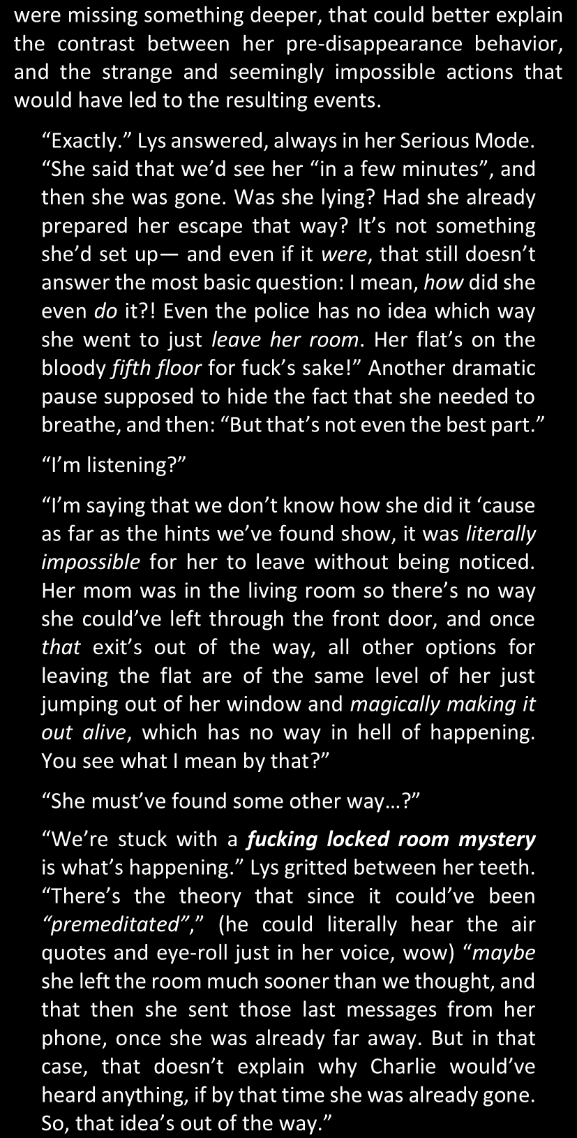 Well, she had a few hypotheses, but none of them really could conveniently justify all the trouble the man must have come into just to order everything in place to the slightest details. That was necessary if he wanted to be convincing of course, but… Just, what was that for?