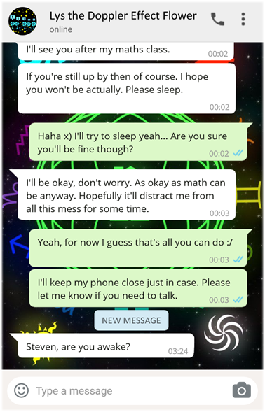After school, Lys walks into a café and meets Isabel face to face for the first time. Despite a rocky start with pseudo-witty remarks and cold glares, their conversation soon gets to the point. Lys unlocks her phone and starts a video call with Steven so he can take part in the conversation as well.