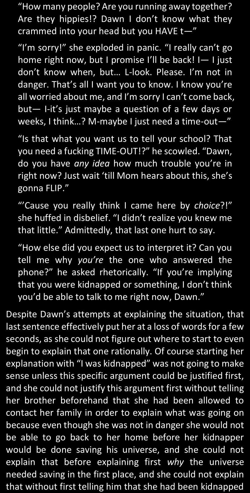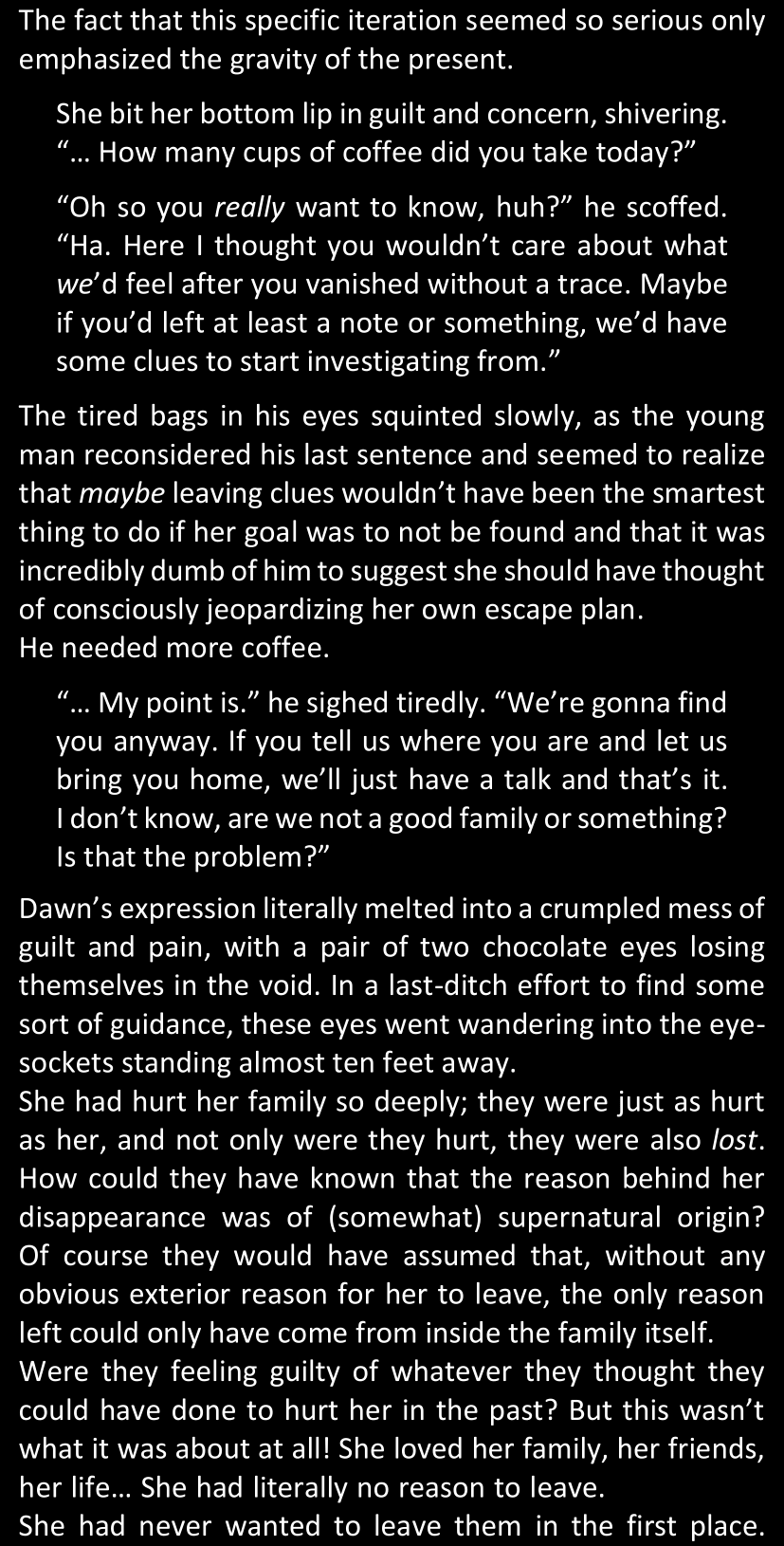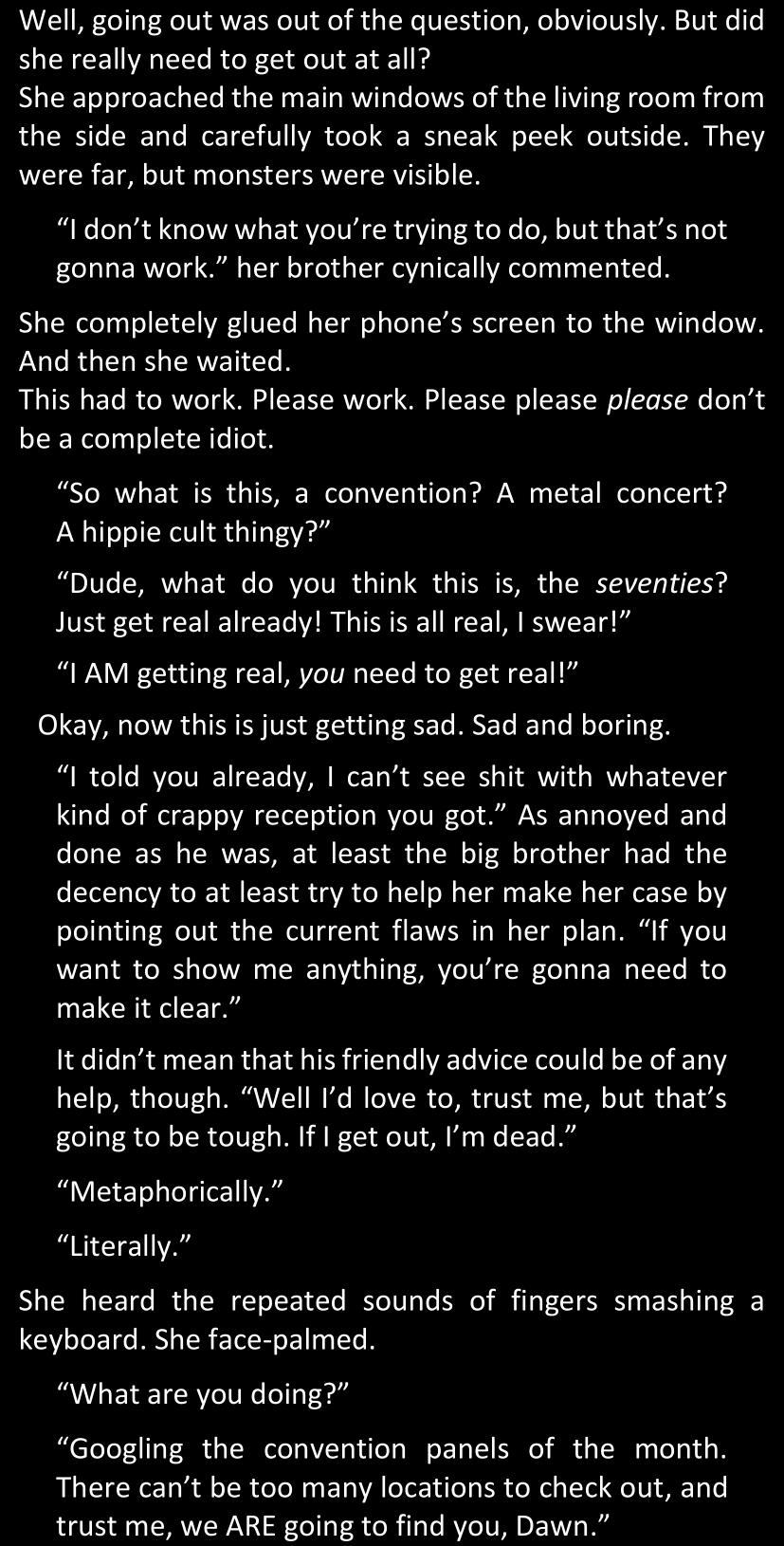 And now that this is out of the way... Here's how things will go from now on. So far, the only docs available in this folder are the beginning of chapter 14, as I was able to write it so far; the "first part" of the LWtQ script, which contains a summary of chapters 14 to 17; and, an extra doc that lists Dawn's online friends and is just really a list of random facts about them. In the future, I will update this fanfic regularly in order to let you know when other parts of the script are done, and a new doc that contains the summary for the next few chapters will be added to the folder.