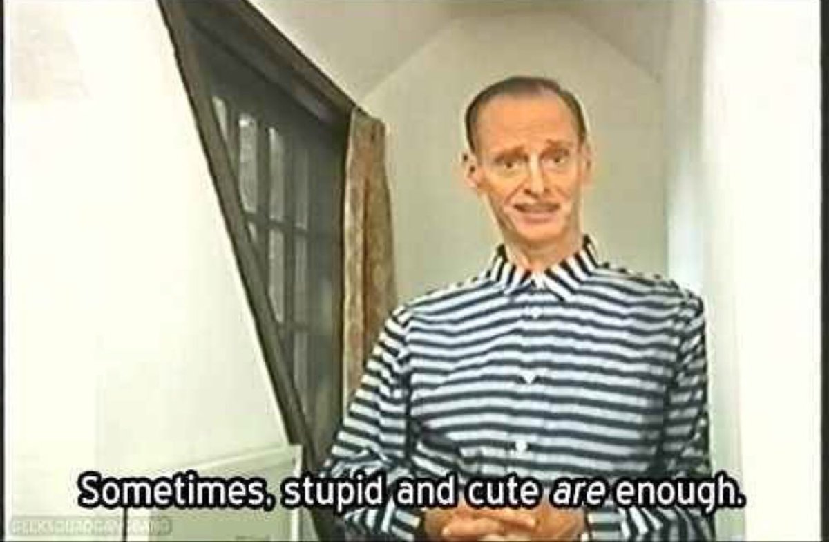 He strokes his thumbs under her eyes, the slowing leak of her tears. “We need to work on your insults. Mr Rogers isn’t doing you any favours.”