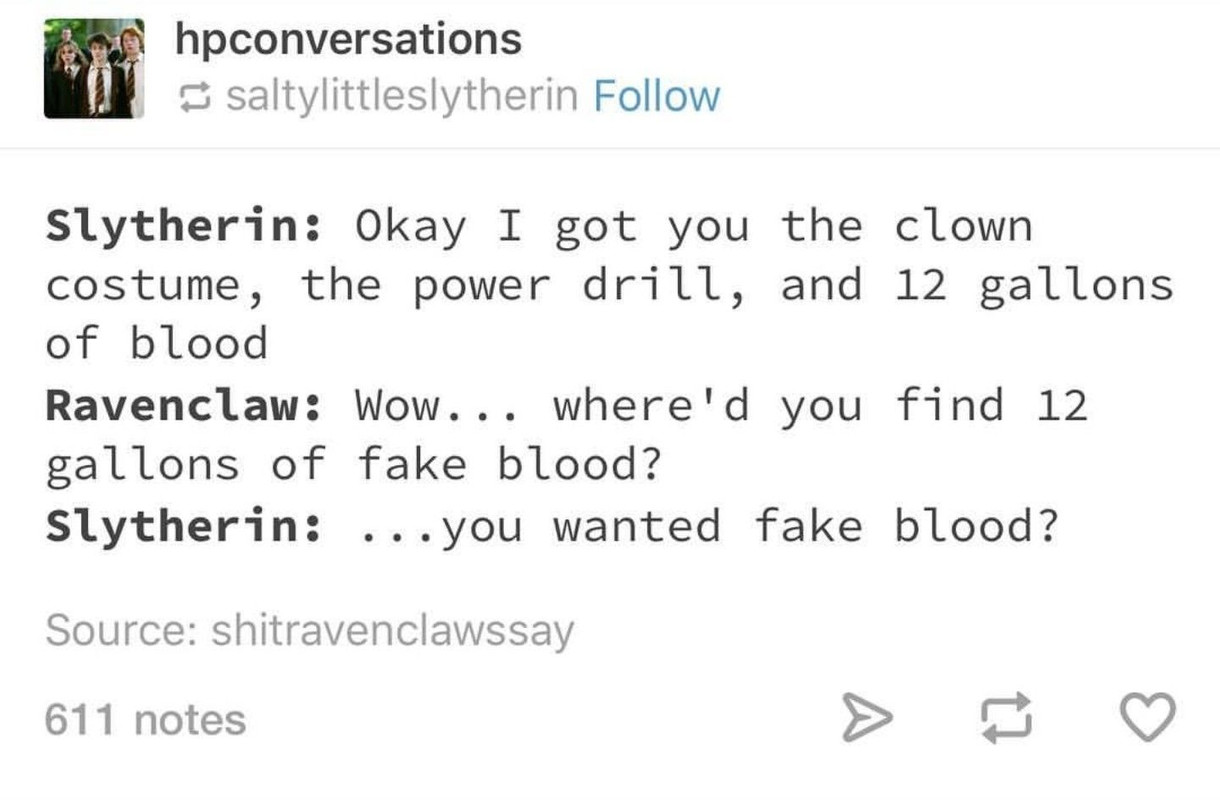 Still... what the fuck? How did Potter know some Slytherins would want to take advantage of the blood? There was no way he could have known some snakes wanted to play a prank on Hogwarts. And there was no way he knew that some guys would take the blood for themselves before themselves even knew! (1)
