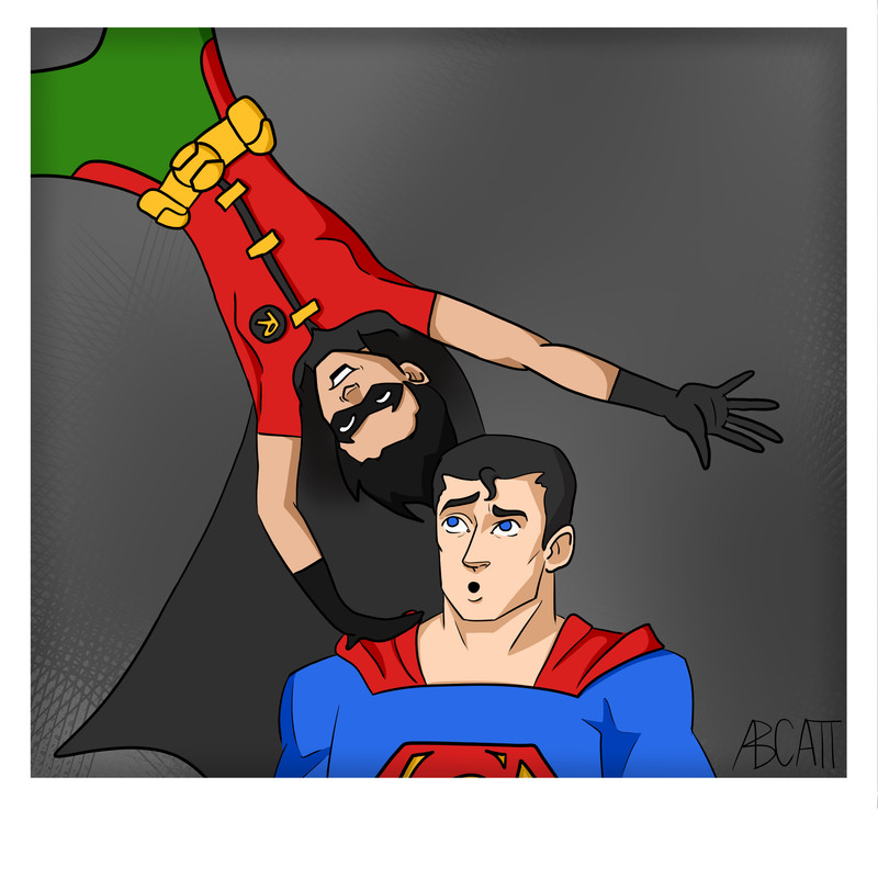 [IMAGE ID: young dick grayson as robin does a one-handed handstand on clark kent as superman's shoulders. dick is smiling and excited, clark is a little confused. the background of the picture is a neutral gray. the art is framed by a white border, like a polaroid picture. signature reads "ABCATT" in the lower right corner. END ID]