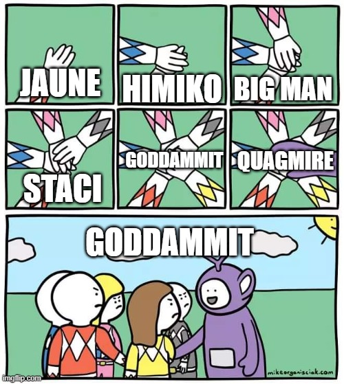 Stellar then cuts out three portals, which summon a tired woman with no sex appeal, a sentient cluster of yellow and white blocks, and a kid on a wheelchair.