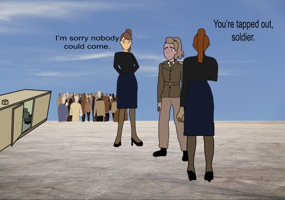 The two ladies walked over and approached the ram-rod straight blonde. “PFC Grayskull?” Hope asked. The blonde remained looking ahead, as she’d been taught. Hope raised her hand and touched Adora’s shoulder. “You’re tapped out, Adora,” She said. Mara stood just behind, waiting until Hope removed her arm and walked away. She walked up to the blonde. “Hey, I’m sorry nobody could come,” She said. Adora sniffled quietly once and turned with pursed lips. “I’m not. If they’re not willing to see me now, then that says all I need to know about them, doesn’t it?"