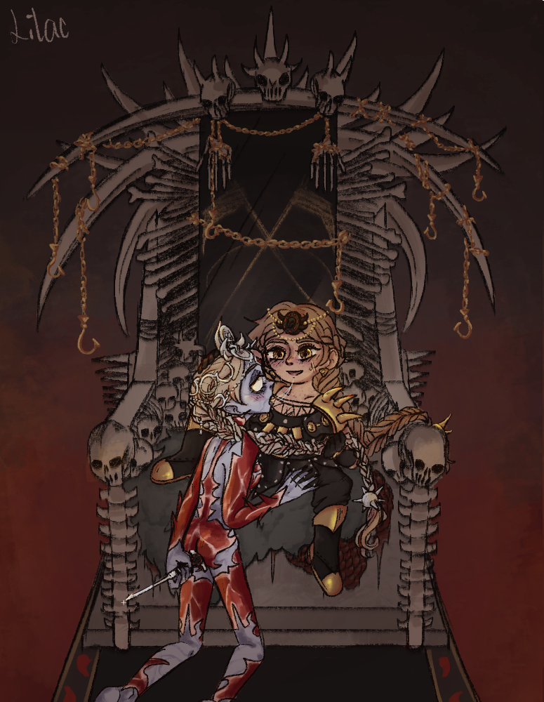 They lick blood from their lip, where his gauntlet cut into the skin, and flutter their eyelashes. “Why do you think I wanted to share a room with you?”