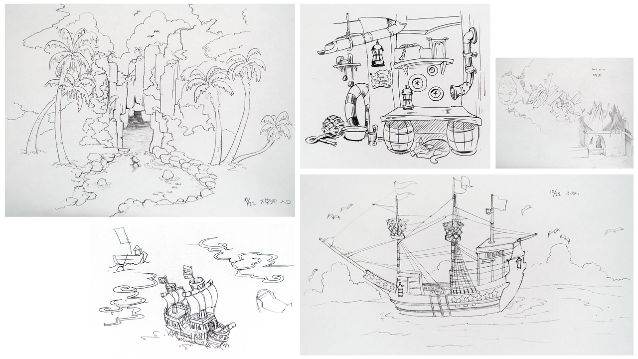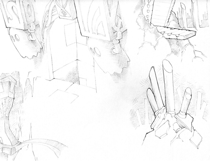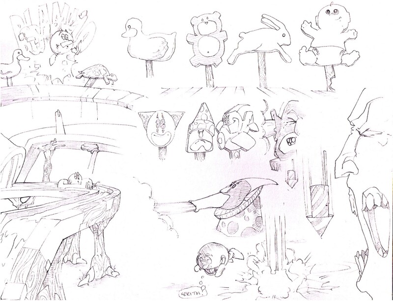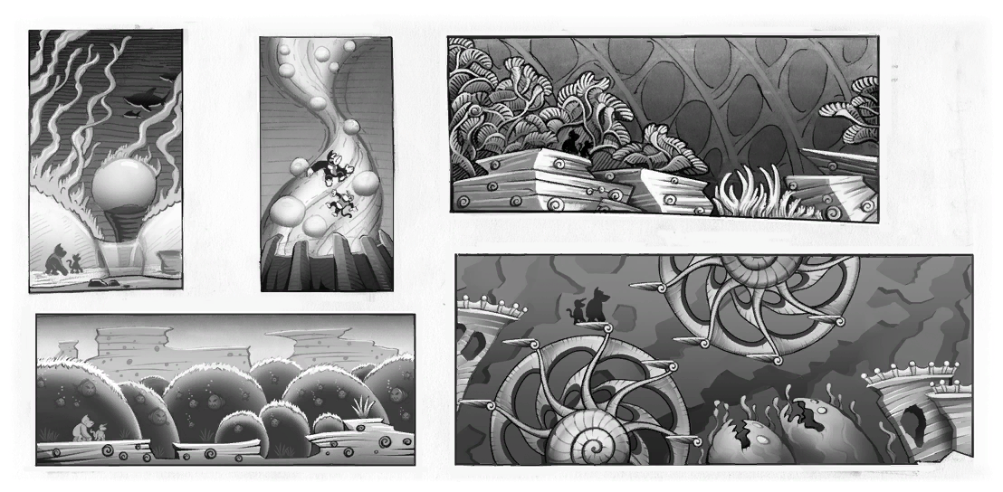 Various early story boards from epic Mickey.