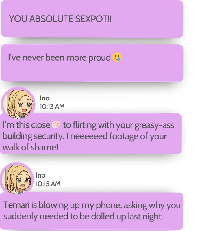 That was why it had to be him. Anyone else—a mutual friend, some polite acquaintance—and Ino would sniff out the lie before the appetizers arrived. But Sasuke? The human equivalent of a locked vault? No one would question it. They'd be too busy picking their jaws up off the floor.