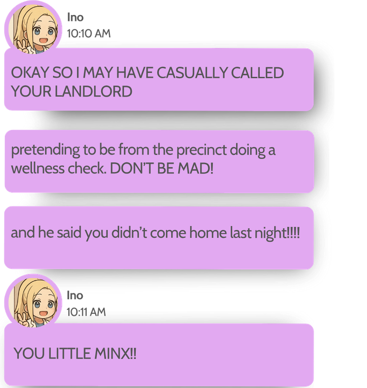 Their other interviews yielded little: classmates remembered Hanabi as distant, polite, and impossible to read. However, none could corroborate the roommate's story about her leaving for term break. The general consensus was that Hanabi avoided home whenever she could. A clubmate mentioned she only returned when her cousin was visiting.