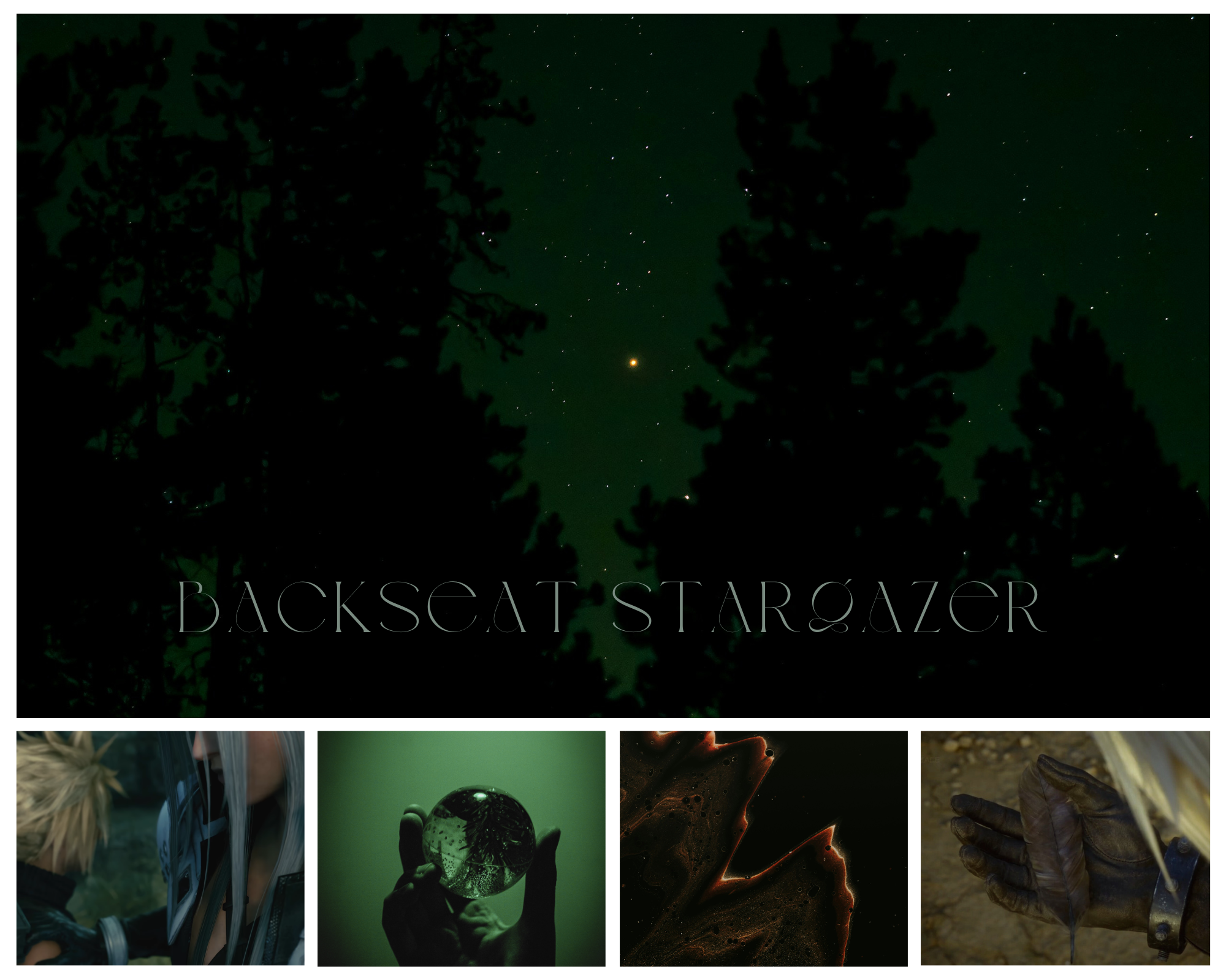 It's getting increasingly dark, so Cloud flips the headlight on. When the first stars begin to appear, he can feel his foe shift behind him. A glance back reveals that Sephiroth has tilted his head to look upwards, the strands of his hair that normally frame his face flying around him wildly. His eyes shine with even more iridescence than usual in the surrounding darkness.