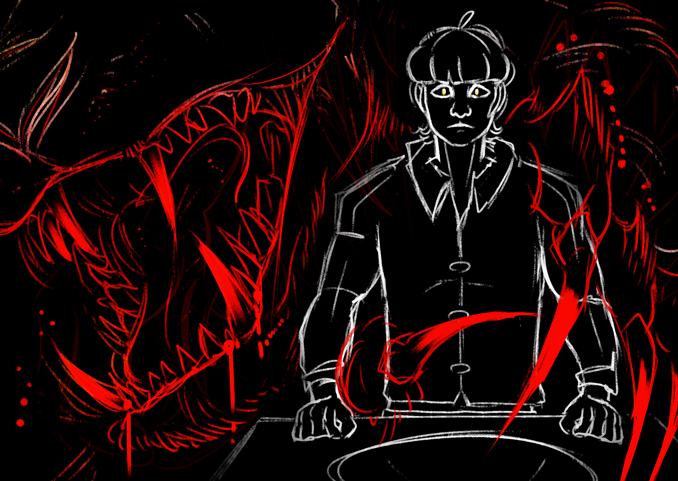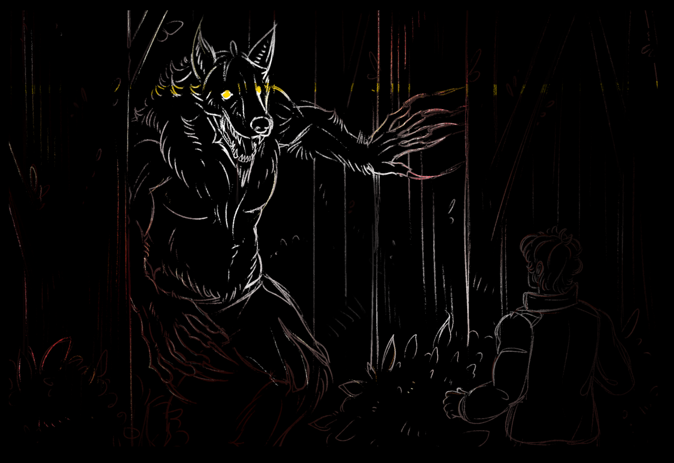 A monster is looking right at him– hulking and uncanny, a creature with the twisted body of a person but the warped flesh of a wolf. Its eyes are unmistakably human. Unblinking as drool shimmers down its maw, the fur around its sharp-toothed mouth is a lighter, matted shade. It takes a step forward.