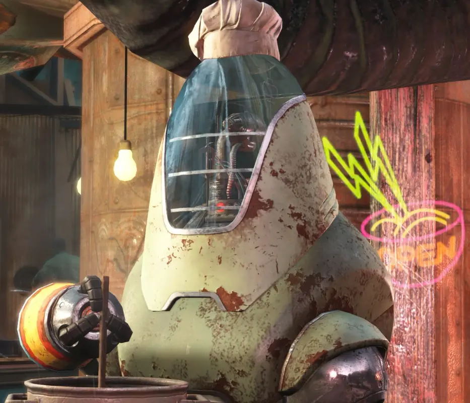 The Overseer stands on the balcony of the third level, her arms crossed over her chest, the Pip-Boy on her wrist flashing wildly in the dim lighting. Her sharp cheekbones are illuminated by the artificial light pouring in from the organic laboratory behind her, presenting her in a ghoulish way. She doesn’t look like his mother. She looks irradiated.