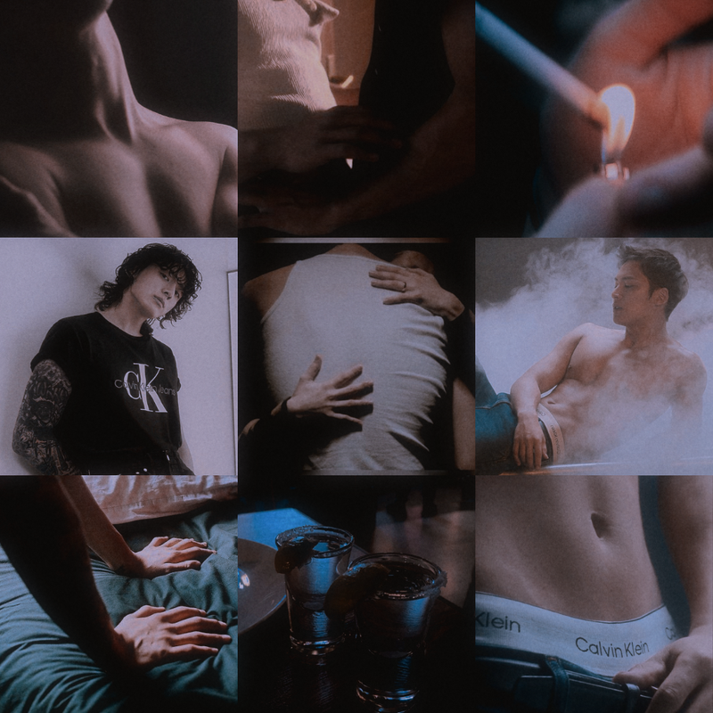 Mingyu just simply nods and sits down, leaning back in the chair as he lights a cigarette and inhales deeply then puffs out his first drag into the chill night's air. Feeling bold, Jungkook also decides to take a seat— but before he goes, he decides to take off his denim jacket and fold it over the arm of the chair. He doesn't miss the look Mingyu gives him, it's like he does a head to toe scan of his frame and his gaze gets stuck on Jungkook's narrow waist. Jungkook hollers from the inside, the boxer is definitely interested despite his nonchalance.